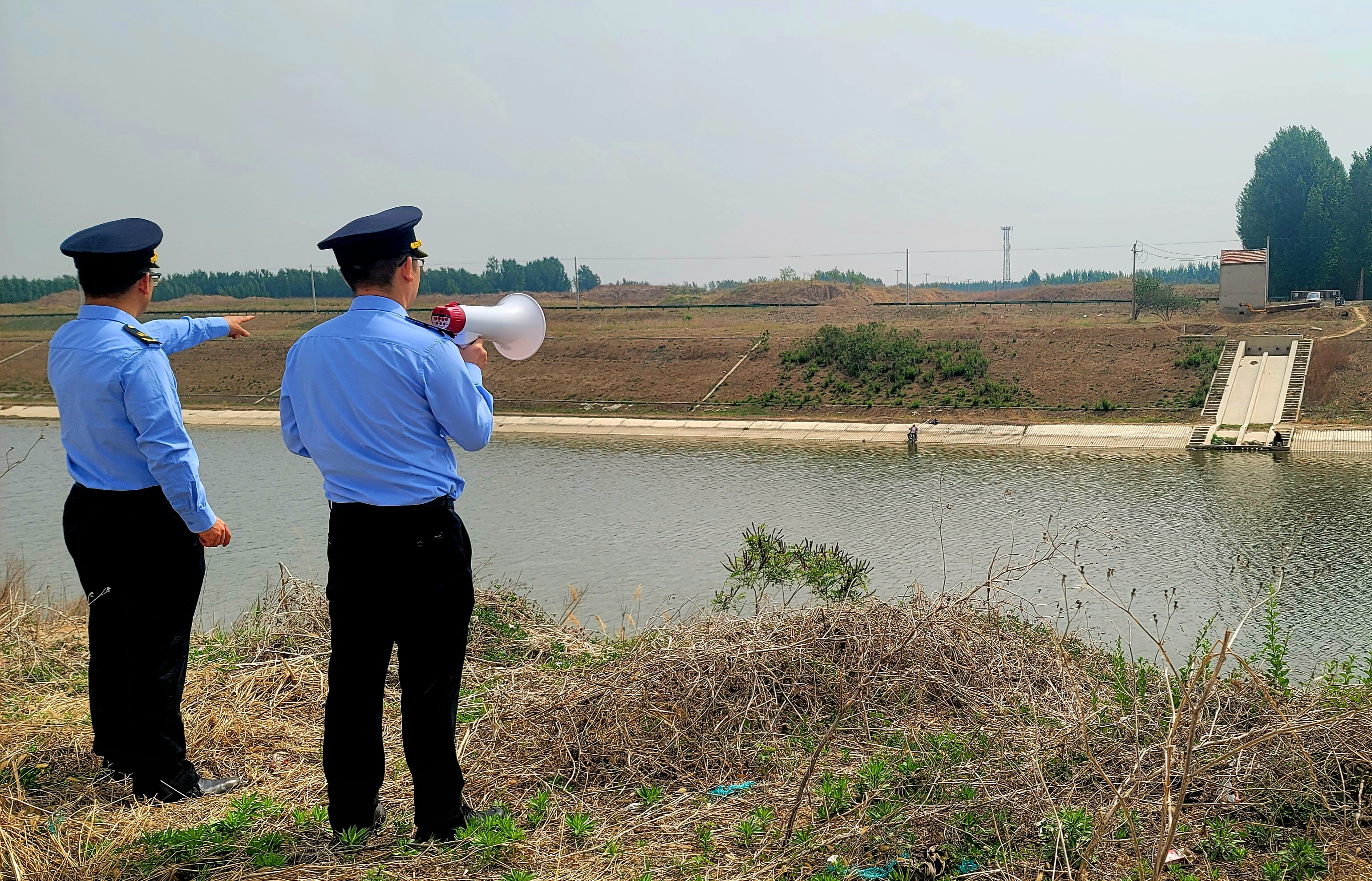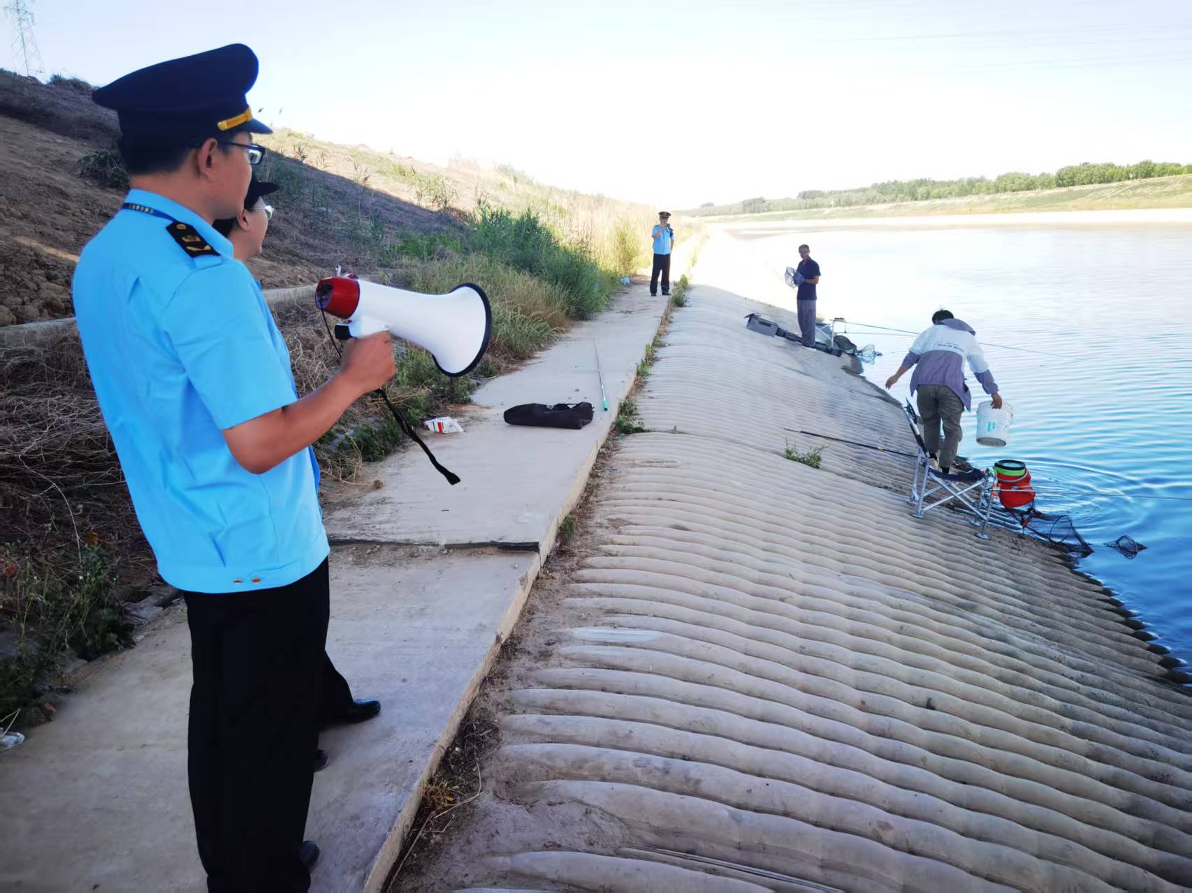 强化现场普法宣教,源头治理违规行为。依据《山东省小清河交通管理办法》第二十一条:“任何单位和个人不得在小清河航道内从事水产养殖、捕捞活动或者设置渔具。”执法人员在人员聚集钓鱼点,通过车载广播、手持大喇叭循环播放法规条款,现场劝离钓鱼和下网捕鱼人员12人次,并警示其行为可能导致船舶螺旋桨缠绕、人员落水等风险。