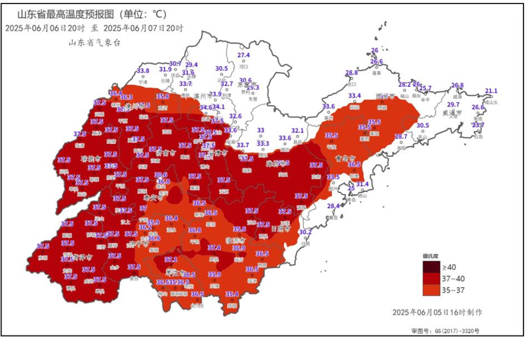 山东省气象台于6月5日16时00分升级高温黄色预警为高温橙色预警:5日下午,鲁西北、鲁中和鲁南地区已出现35℃以上的高温天气,局部地区最高气温38℃左右。预计6日和8—9日最高气温,菏泽、济宁、聊城、德州、滨州、东营、济南、淄博和潍坊37~39℃,局部可达40℃,南部沿海地区24~30℃,其他地区33~36℃。7日,受冷空气影响,北部地区气温略有下降,最高气温,菏泽、济宁、聊城、德州南部、济南、淄博和潍坊南部37~39℃,沿海地区24~30℃,其他地区33~36℃。10日,我省大部地区最高气温将降至35℃以下,高温过程结束。 此次高温天气有利于小麦收割和晾晒,对人体健康、森林防火、户外作业和城乡用电等有不利影响。高温过程正值高考,请加强防范。