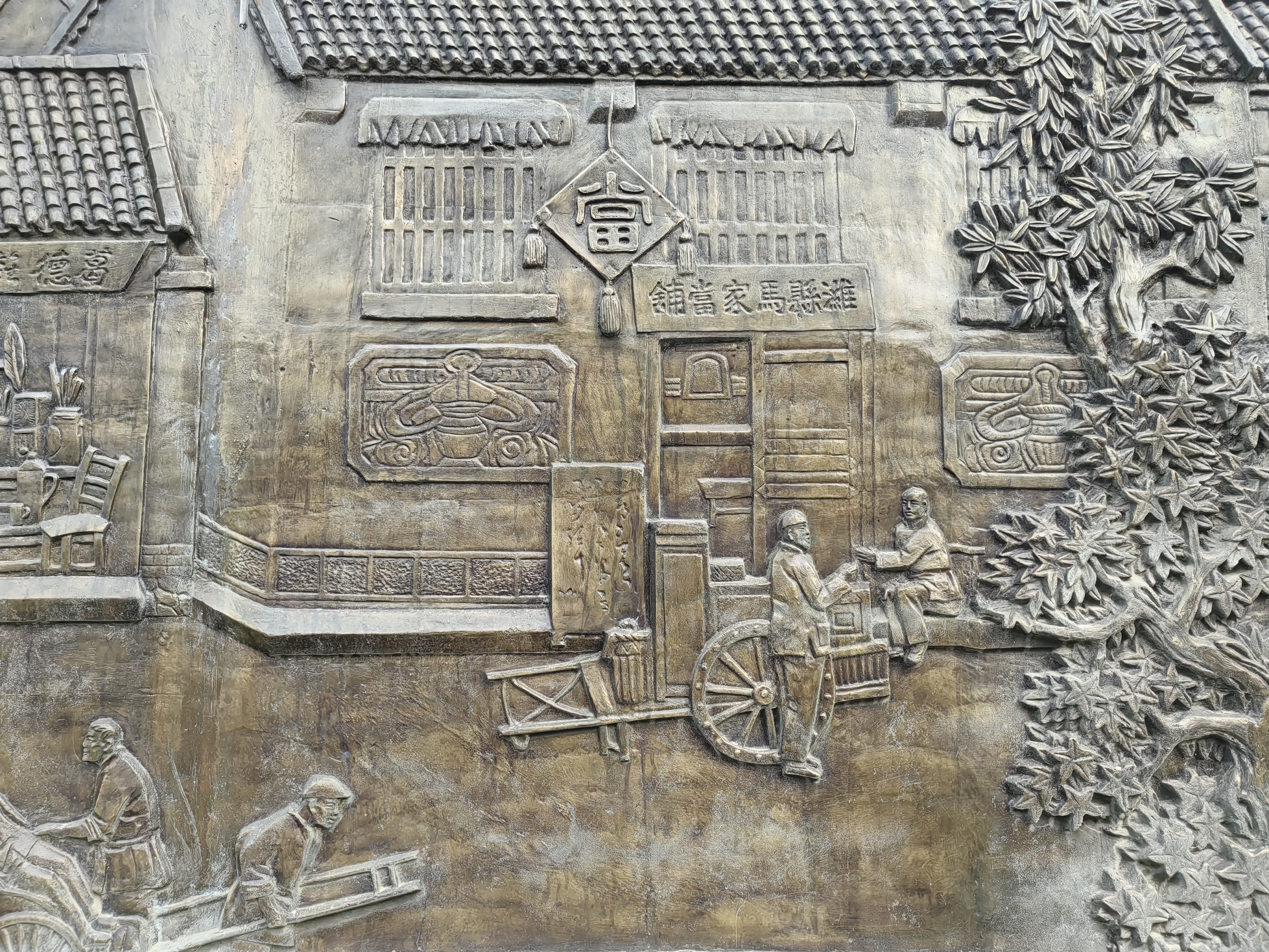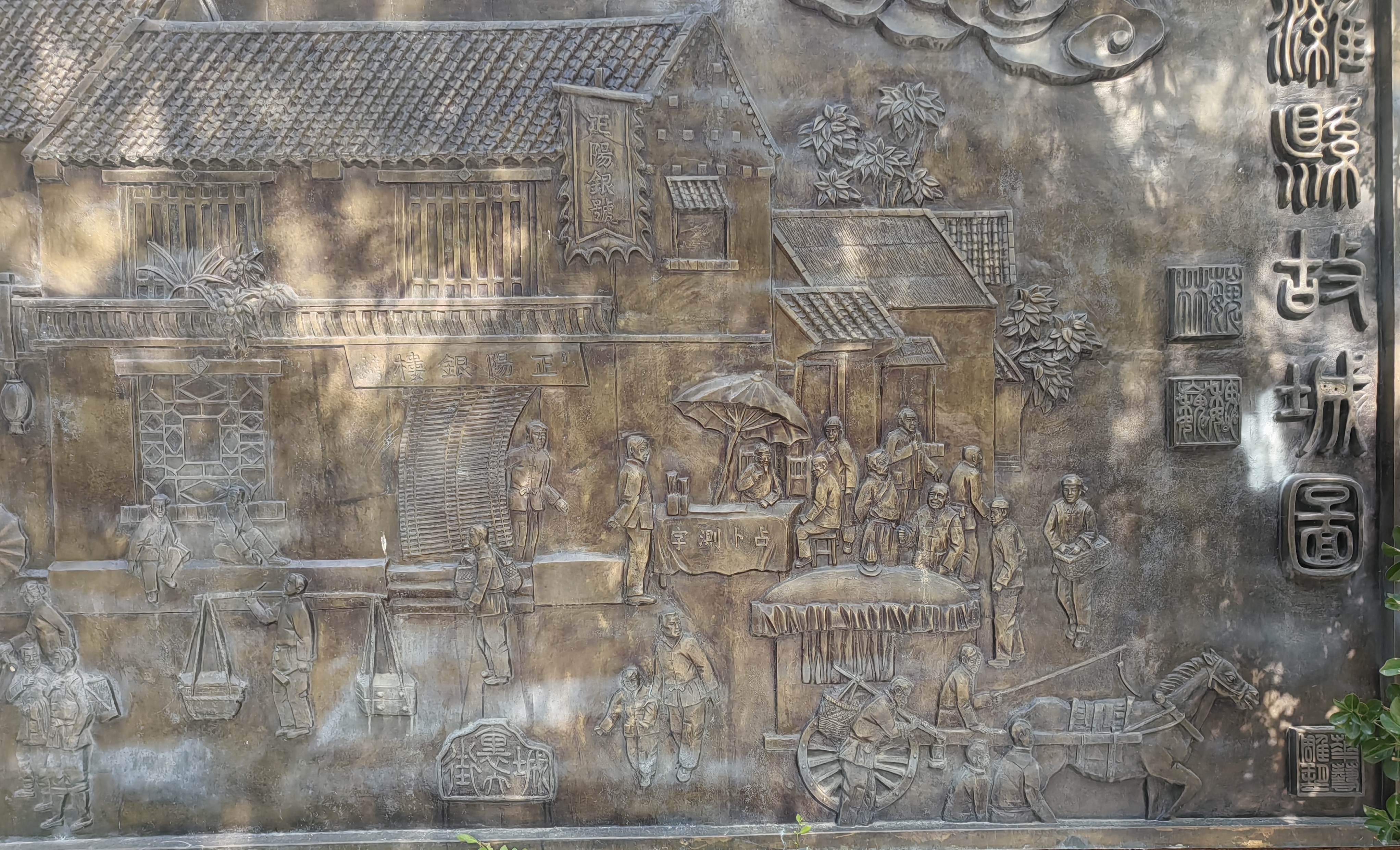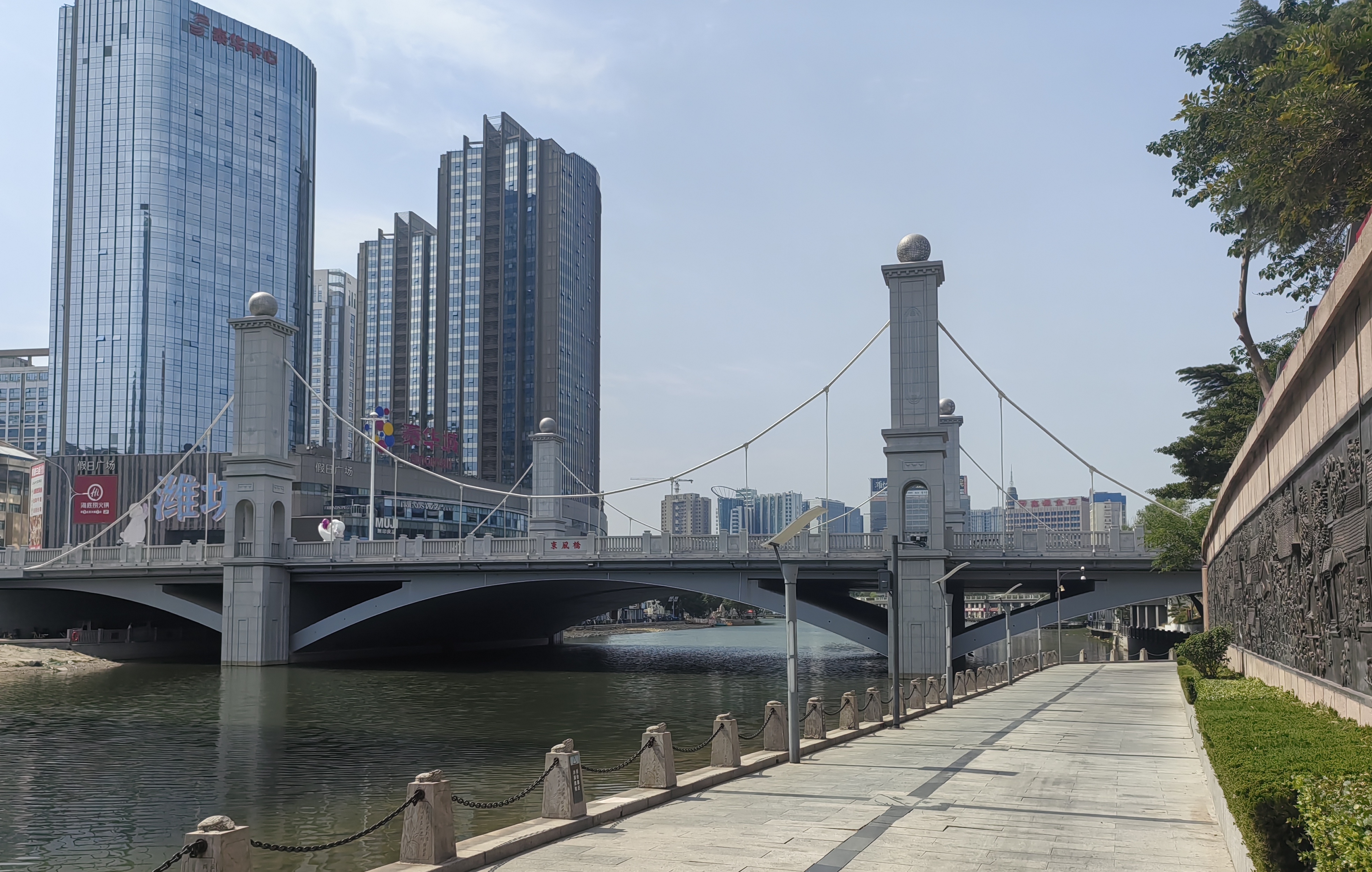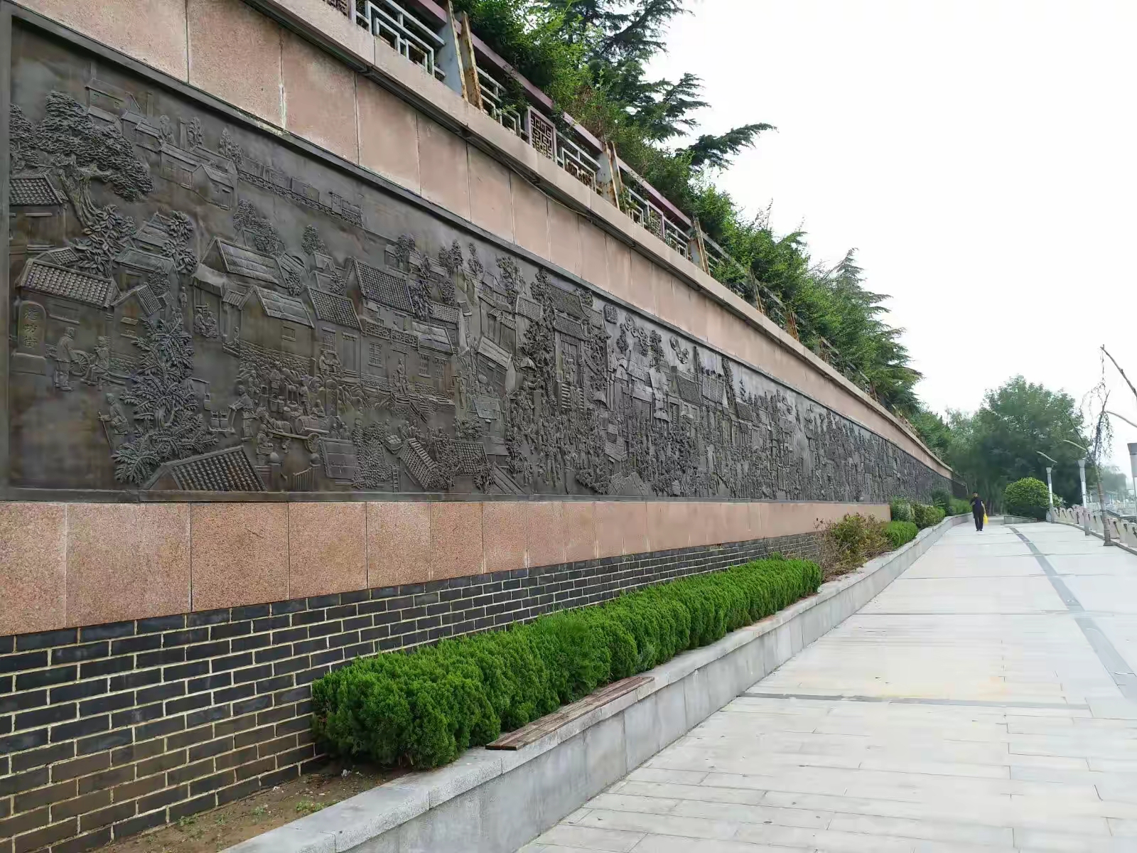 夏日的清晨漫步在潍坊市白浪河畔,欣赏河对面的高楼大厦,浏览《潍县故城图》。《潍县故城图》铜雕壁画位于潍坊市白浪河西岸,过去老潍县的故事浓缩在这200多米长的壁画中。