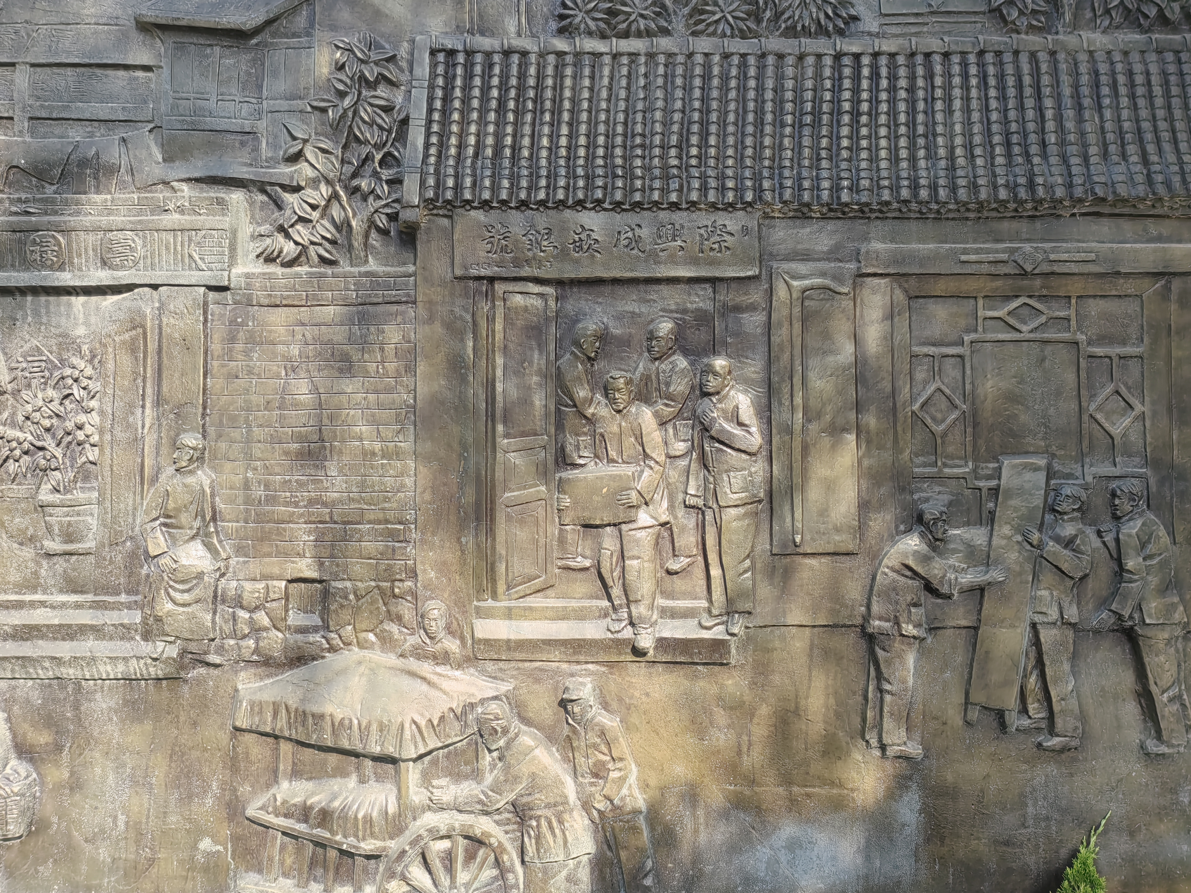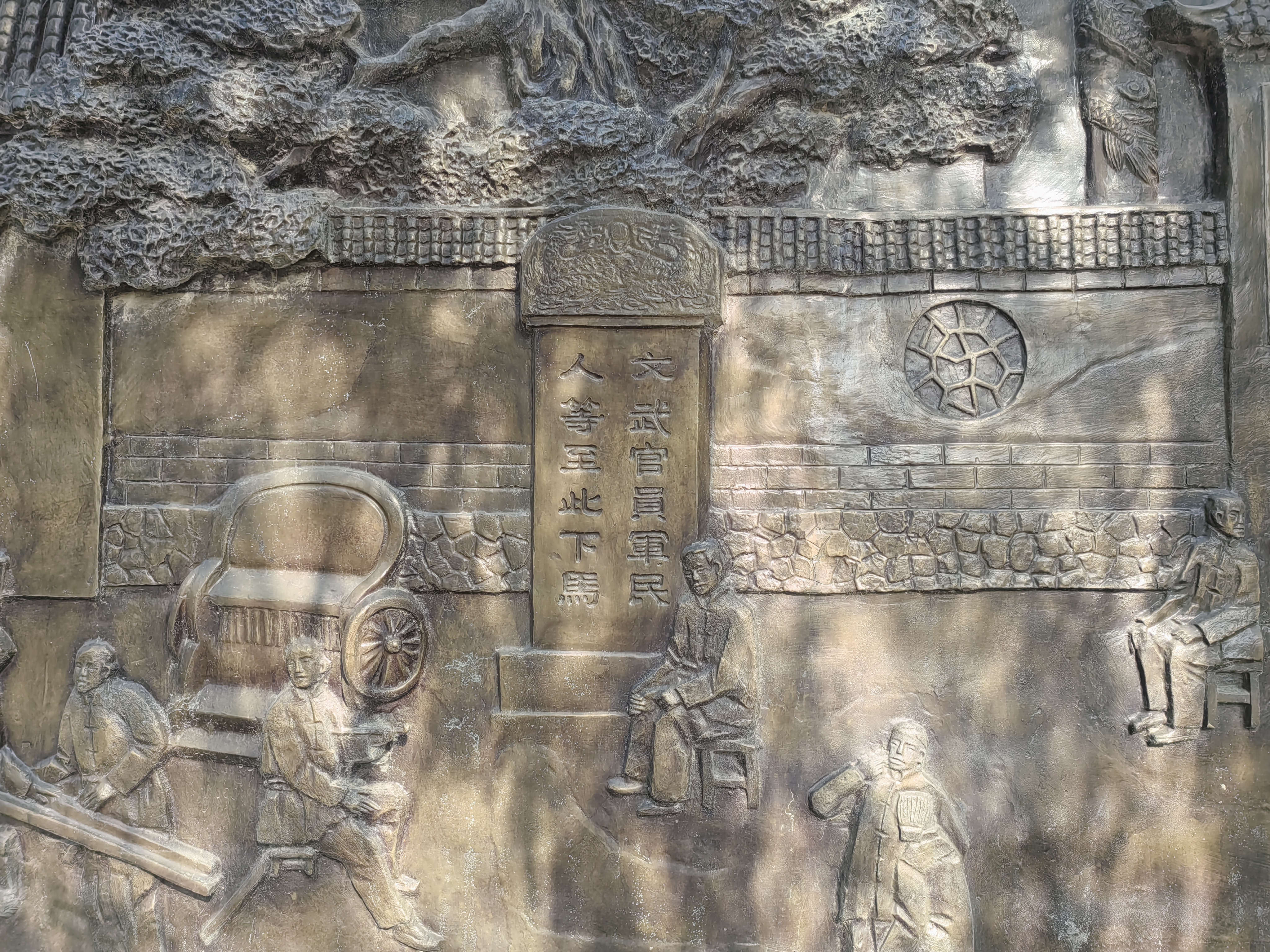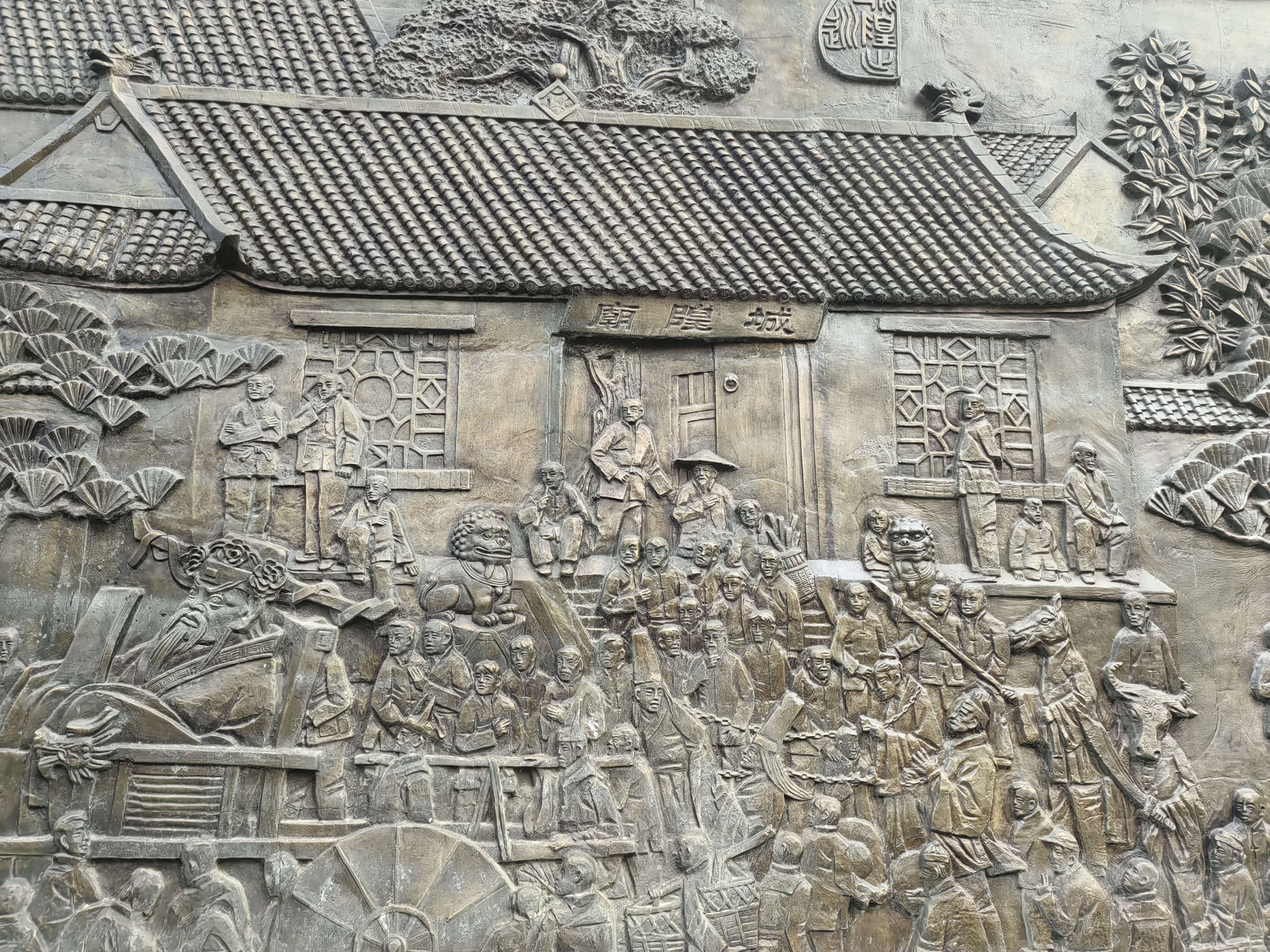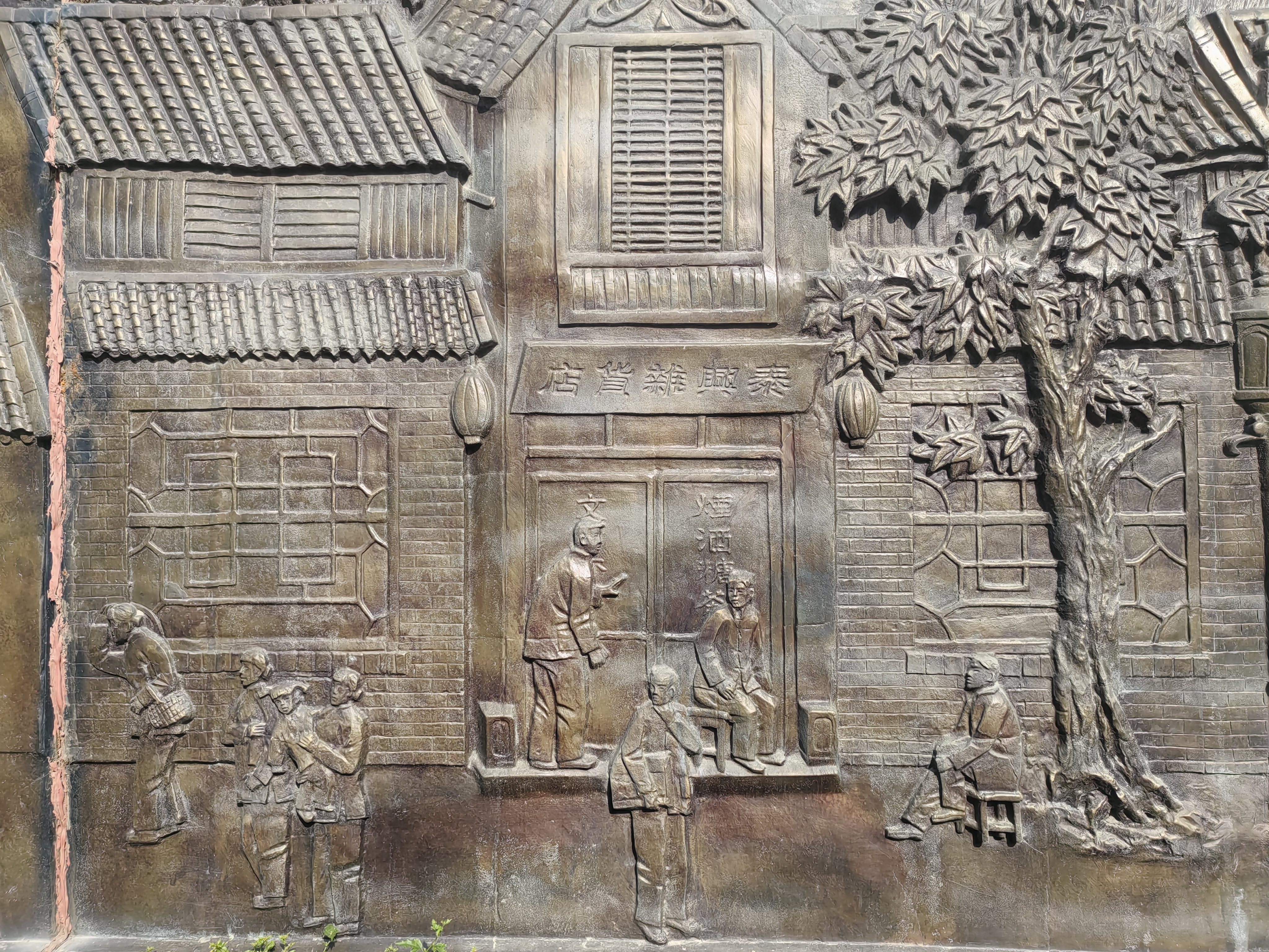 夏日的清晨漫步在潍坊市白浪河畔,欣赏河对面的高楼大厦,浏览《潍县故城图》。《潍县故城图》铜雕壁画位于潍坊市白浪河西岸,过去老潍县的故事浓缩在这200多米长的壁画中。