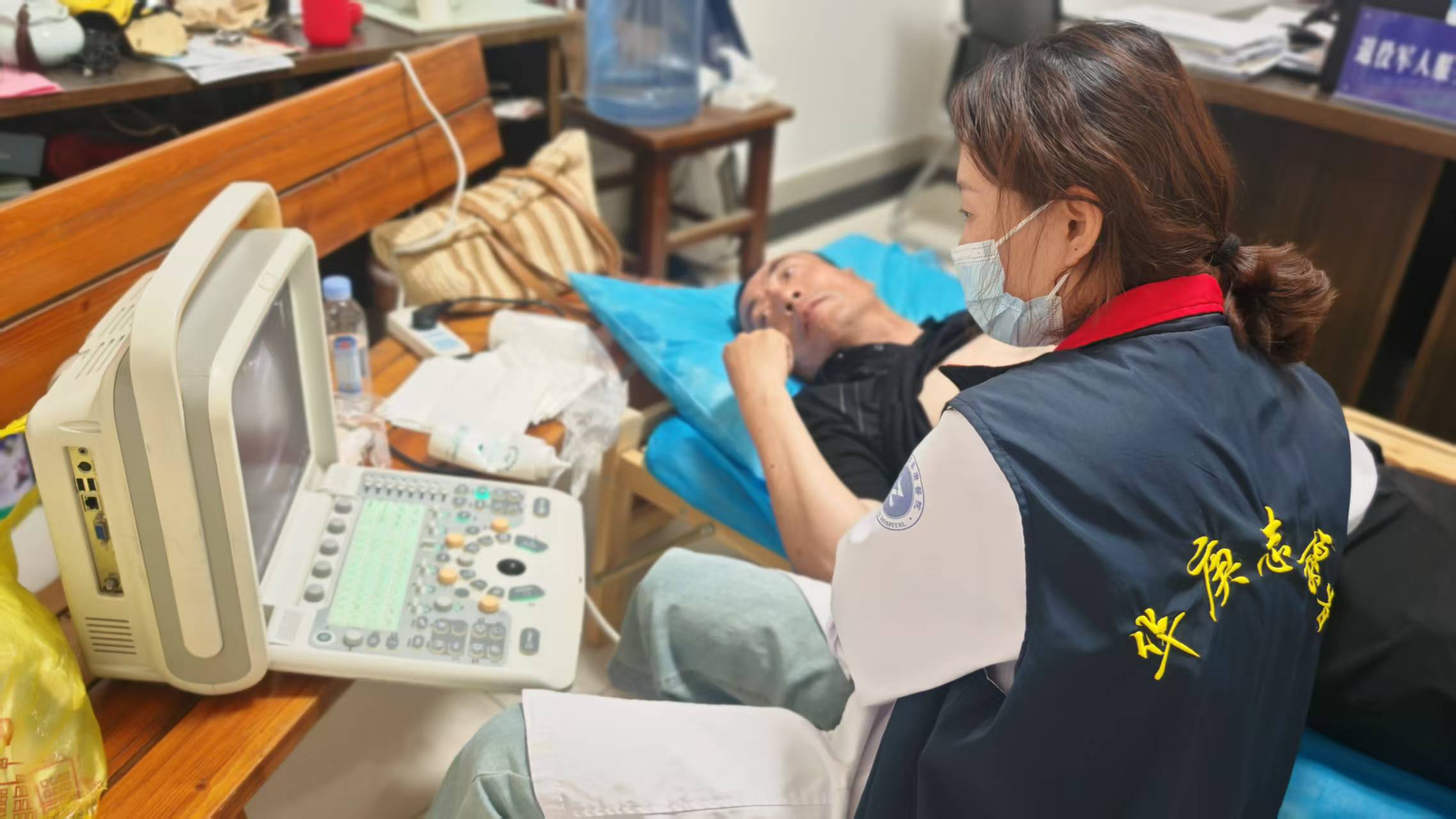当天早上7点50分,医疗队来到了付坡村村委办公楼前,入眼是排列整齐的居民楼、干净整洁的路面和绿意盎然的绿化带,得知有专业医疗队上门看诊的村民,早早地来到村委门前坐着马扎等待。简单介绍后,医务人员迅速布置义诊现场,安置彩超机、心电图机,烧制热水制作膏药,为玻璃罐消毒……