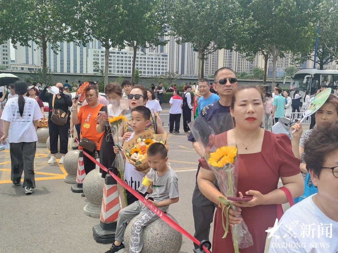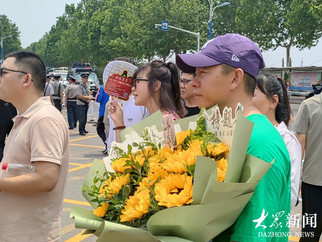 考场内,考生奋笔疾书;考场外,父母翘首以盼。6月7日中午11点20分,高考语文考试即将结束,淄博市临淄中学考点门口已经聚集了不少家长,妈妈们身穿寓意“旗开得胜”的旗袍,爸爸们手举象征“一举夺魁”的向日葵,满脸期待地等候孩子凯旋。