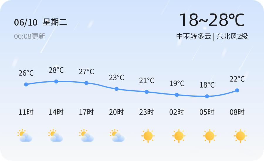 今天是6月10日,星期二,农历五月十五。临沂市今日天气为中雨转多云,气温介于18℃至28℃之间,湿度高达94%,风向为东北风2级。各区天气状况基本一致,市民出行请注意携带雨具,防范降雨带来的不便。