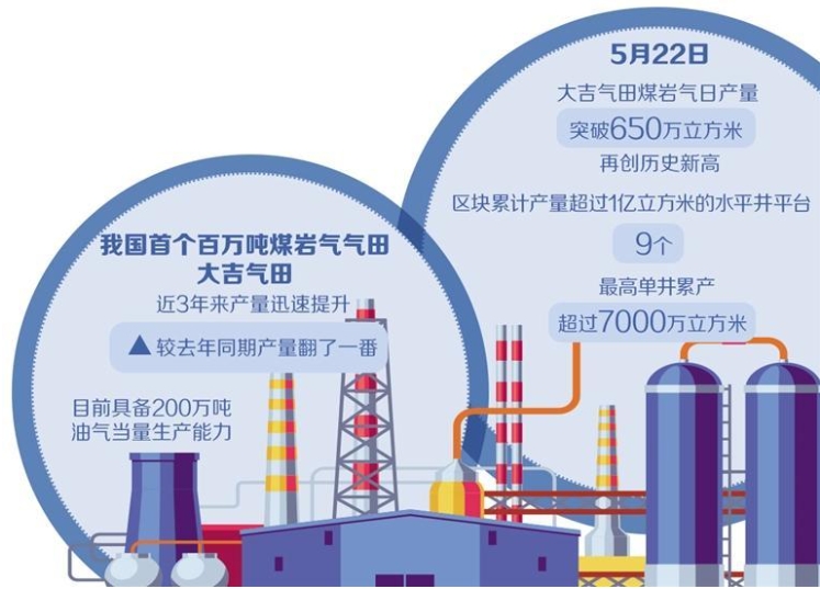 2024年8月30日,中国石油高效建成我国首个百万吨油气当量煤岩气田——大吉气田。2025年3月27日,大吉气田实现二开水平井核心技术突破,采用二开井身结构,实钻水平段长度1587米,打破二开结构水平井最长水平段纪录及最快钻完井周期双纪录。4月23日,长庆油田成功完钻国内首口2500米超长水平段煤岩气水平井,刷新我国陆上煤岩气超长水平段、水平段一趟钻和最长裸眼段3项纪录。5月22日,大吉气田煤岩气日产量突破650万立方米,再创历史新高;区块累计产量超过1亿立方米的水平井平台达9个,最高单井累产超过7000万立方米。
