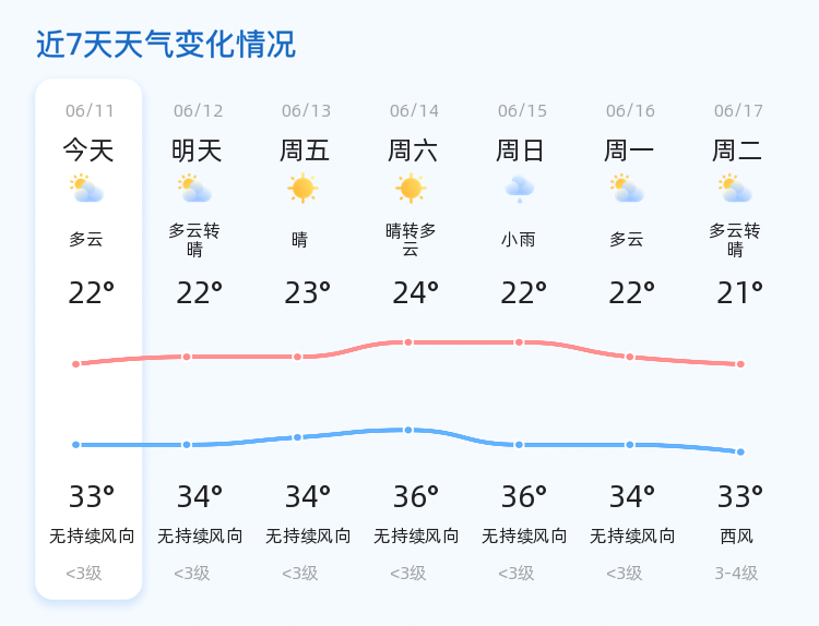 今天是6月11日,星期三,农历五月十六。菏泽市今日天气多云,气温在22℃至33℃之间,东南风2级,空气湿度为75%,PM2.5指数为65。各区天气情况总体平稳,以多云为主,局部地区偶有微风,适合市民出行和户外活动。