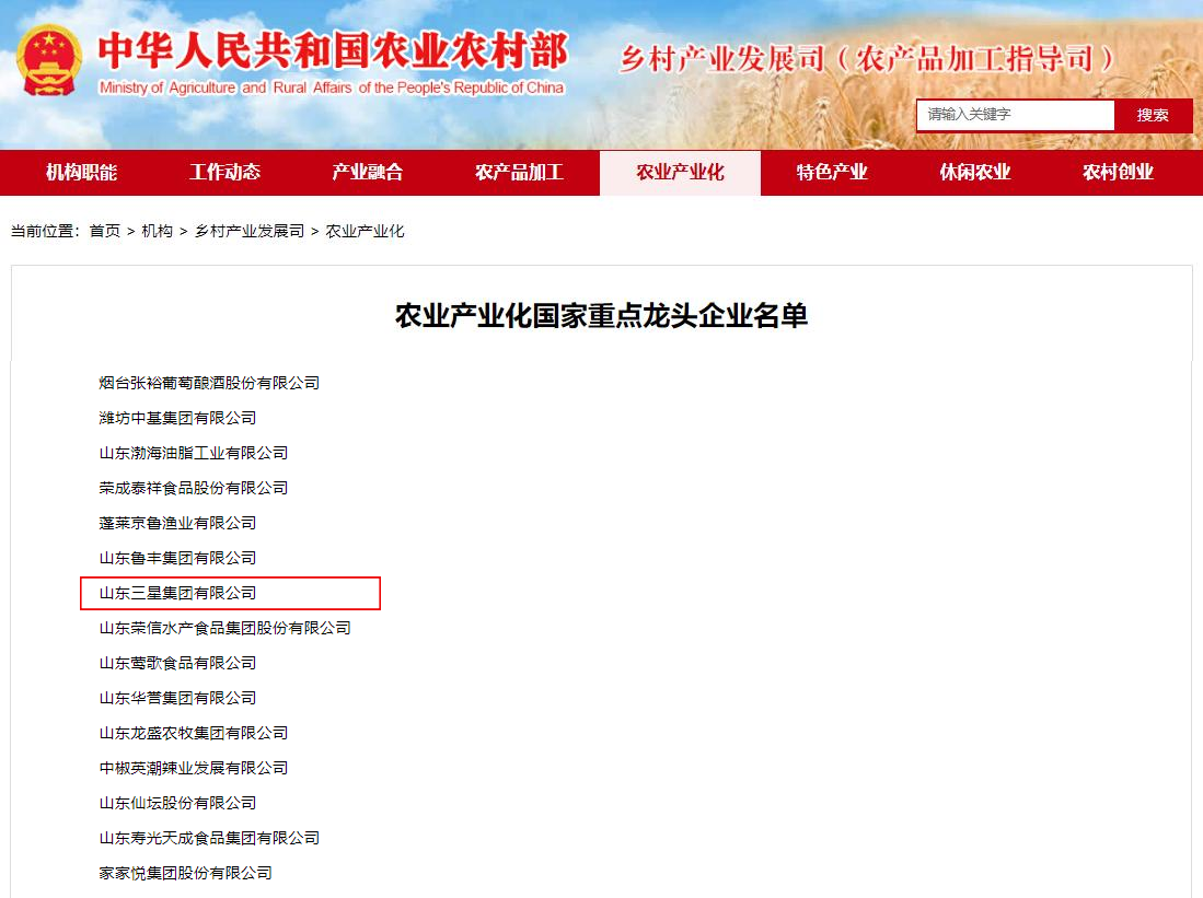 山东三星集团连续15年上榜农业产业化国家重点龙头企业