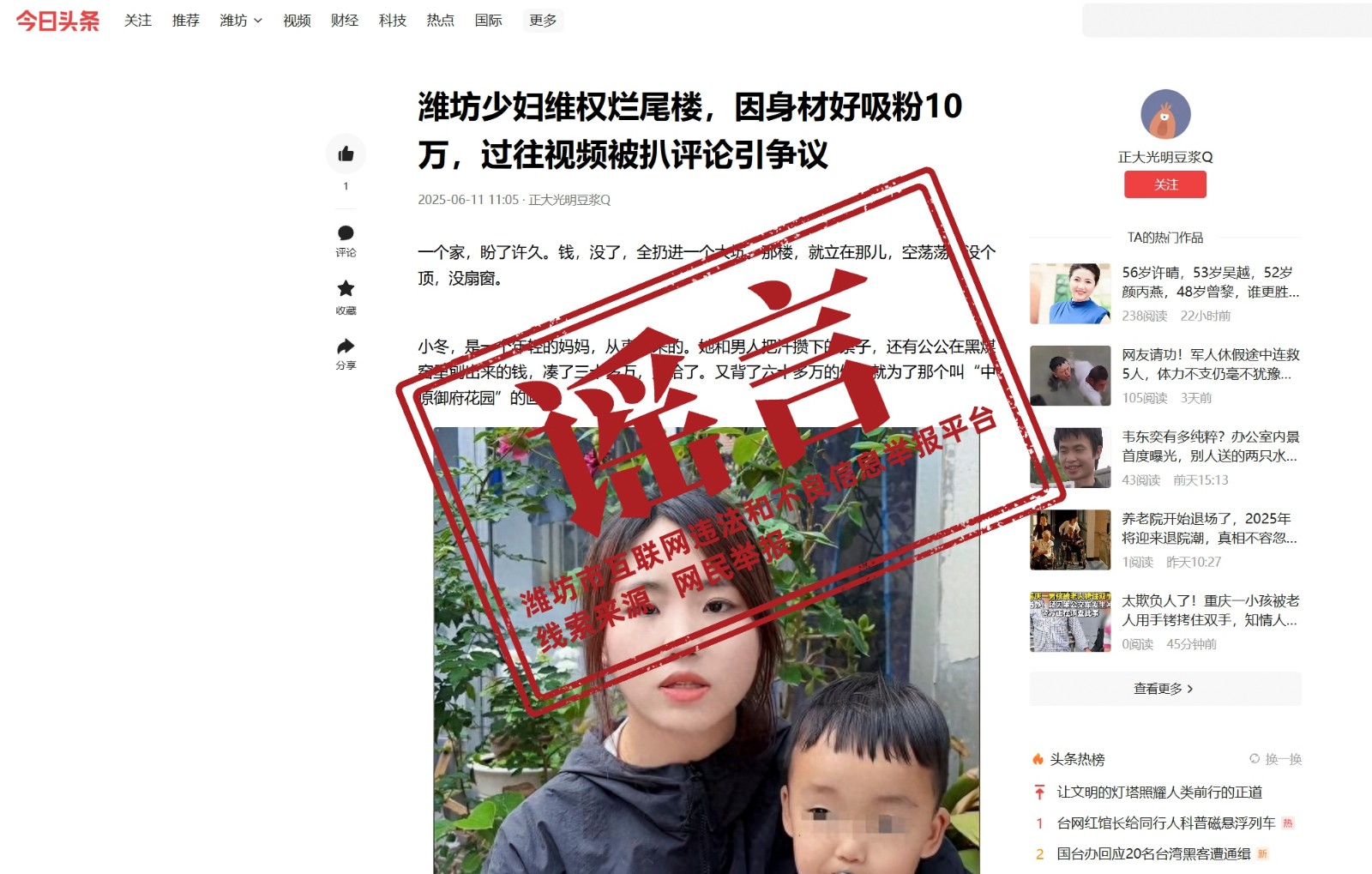 近日,网络上流传着一则关于“潍坊少妇维权烂尾楼,因身材好吸粉10万,过往视频被扒评论引争议”事件信息。经核实,事发地非潍坊。网络上流传的事发地为潍坊的说法是谣言。