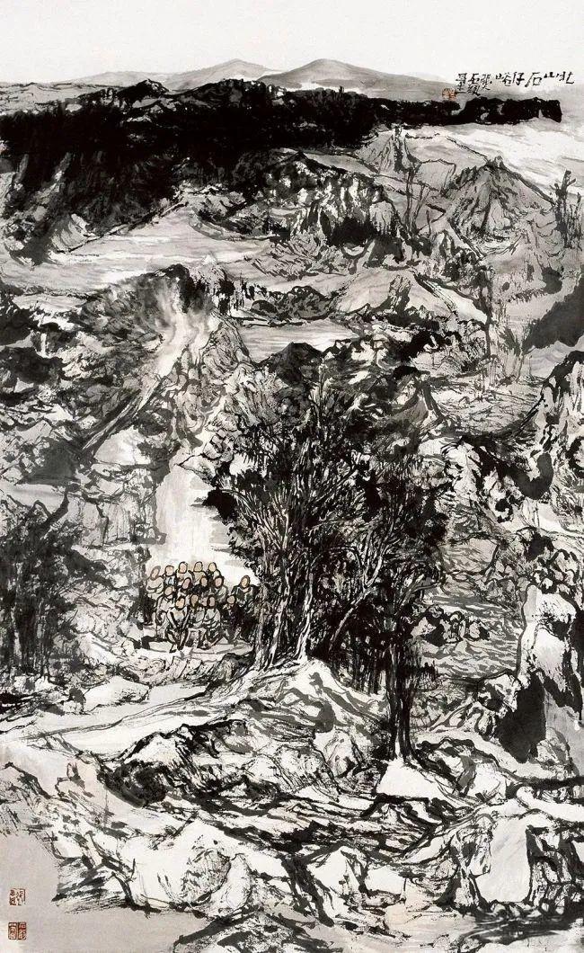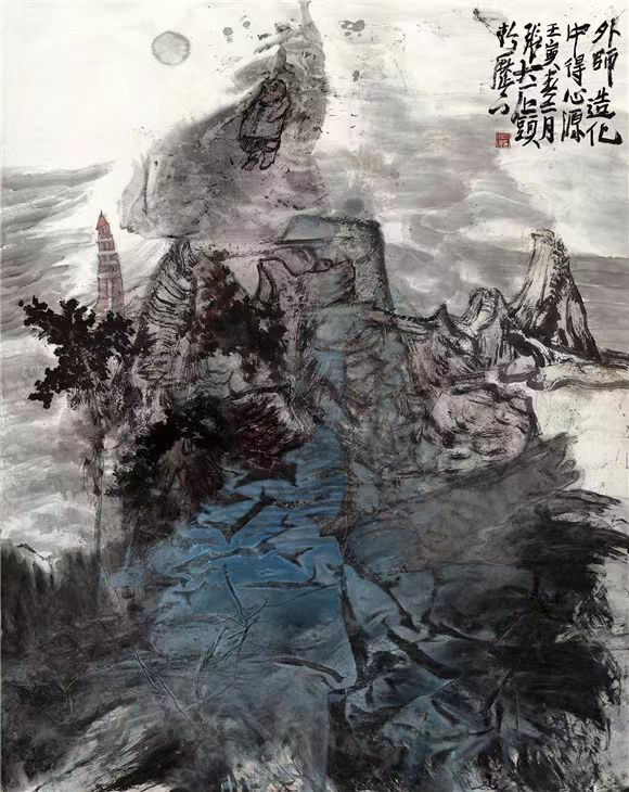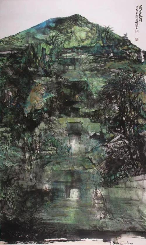 其笔墨厚重如积雪压枝,苍润如古藤缠石。用墨处,多叠染而少浮饰,墨色之间,分五彩而不着五彩。其皴擦点染,讲求节奏,以律动见其情思;其积墨沉厚,起伏如钟鼓之应,气韵连贯,笔势所至,墨气氤氲如云。然其厚而不滞,重而不板,动静交融,寂中生声。
