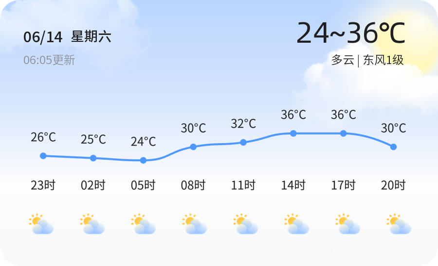今天是6月14日,星期六,农历五月十九。济宁市今日天气多云,气温介于24℃至36℃之间,东风1级,空气湿度86%,PM2.5指数为43,属于良好空气质量。今日气温较高,市民出行时建议做好防晒措施,随身携带遮阳伞和水壶,以应对高温天气带来的不适。此外,空气质量良好,适合户外活动,但需注意及时补水,避免中暑。