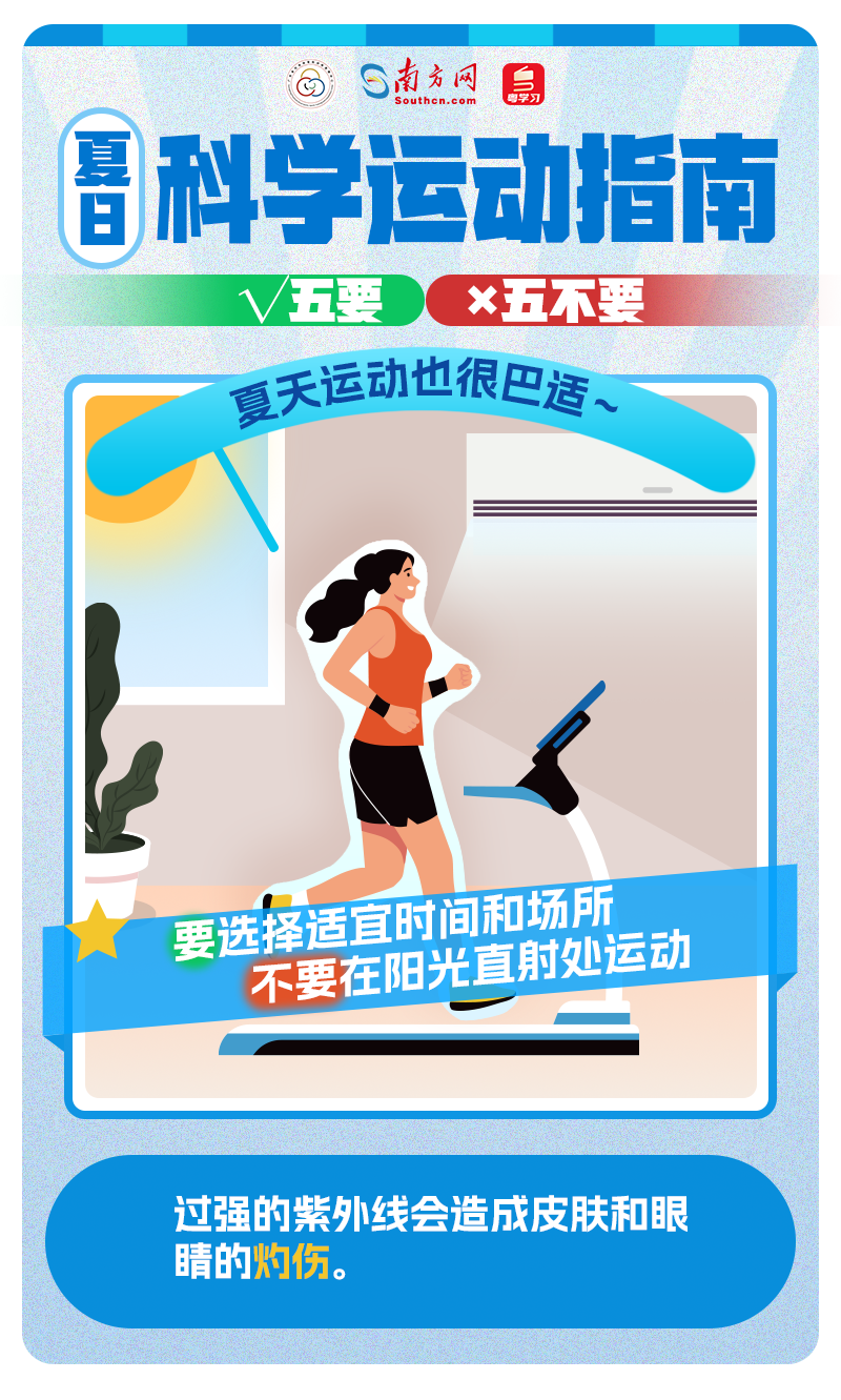 注意不要在阳光直射处运动,过强的紫外线会造成皮肤和眼睛的灼伤,甚至可能导致皮肤癌。同时,室内运动时也要注意空调温度适宜,并保持屋内通风~