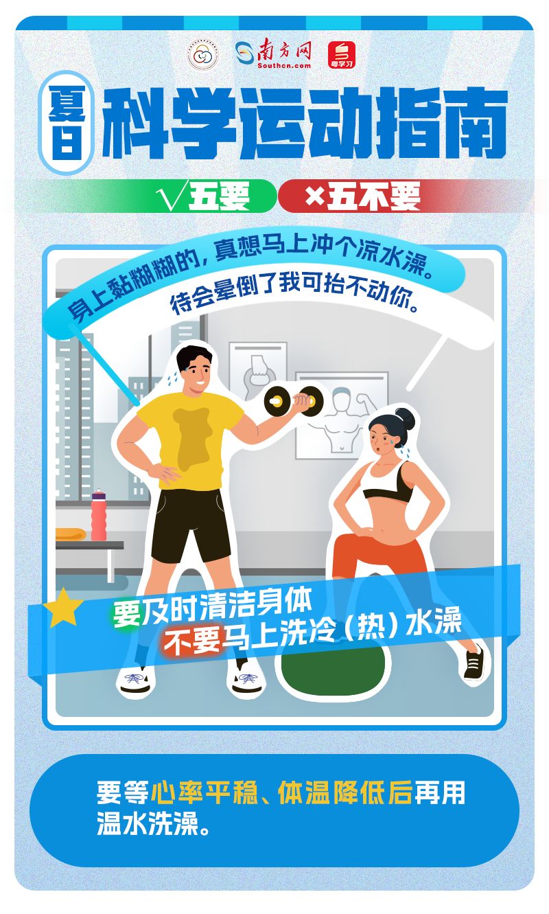 夏日运动出汗多,及时洗澡有助于清洁汗液和污垢,保持皮肤健康清爽,但是要注意不能马上洗澡。刚结束运动时,身体毛孔处于完全张开的状态,如果此时突然洗澡,可能导致头晕、心慌等情况。建议运动过后,稍事休息,等心率较为平稳、体温稍微较低之后,再用温水清洗身体,时间控制在20分钟以内。