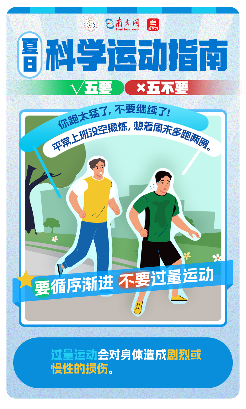 夏日运动,对体能的消耗大,运动时应选择适合自己的强度,切忌“过激”“过急”。有运动习惯的人群,运动量可适当比春秋季减少1/3,运动时间最好控制在60分钟以内。没有运动习惯的人群,要循序渐进、适度运动,不要突然进行高强度、长时间的运动,也不要突击式运动。过量运动会对身体造成伤害,甚至是造成剧烈或慢性的损伤。