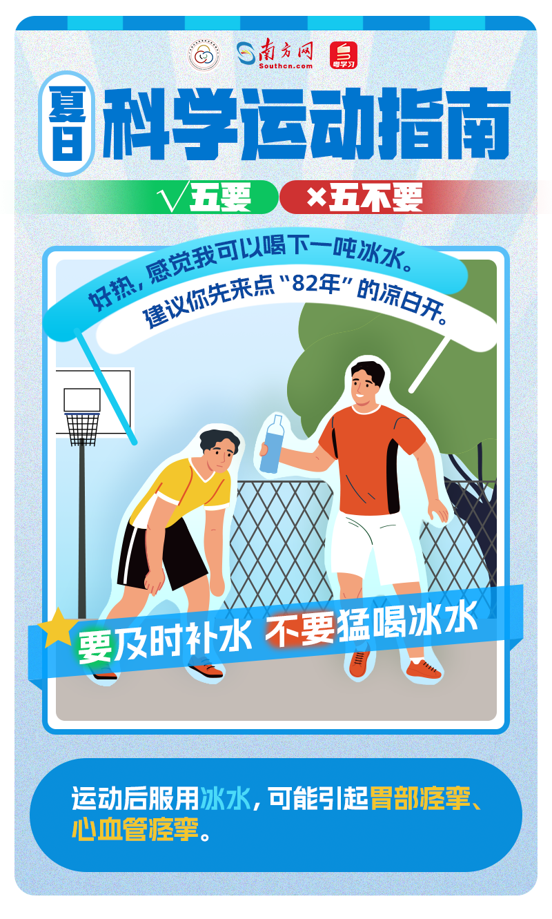 夏季运动出汗多,需要及时补充水分、盐分,以防止身体缺水、脱水。在补充水分时,尽量选择矿泉水、凉白开,也可选择淡盐水或含糖电解质水。不要喝汽水、咖啡等饮料,更不能猛喝冰水、冷饮!