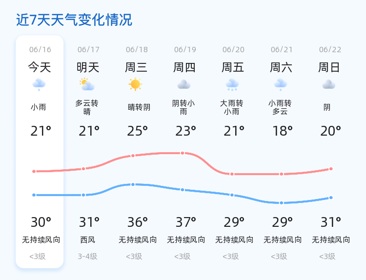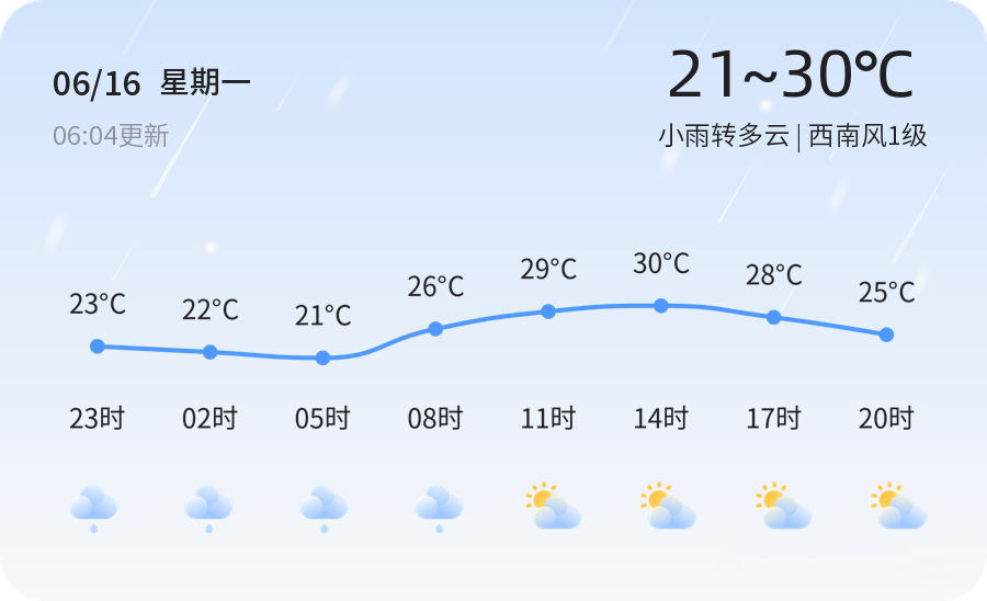 今天是6月16日,星期一,农历五月廿一。潍坊市今天天气为小雨转多云,气温在21℃至30℃之间,西南风1级,空气湿度为71%,PM2.5指数为37,空气质量良好。各区天气情况总体平稳,市民出行需注意携带雨具以防小雨天气。