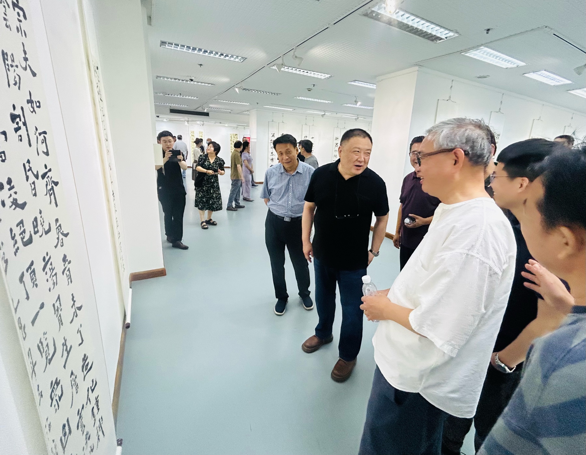 在一幅金文作品前,前来参加开幕式的山东书协主席王瑞和副主席于剑波交谈说,(展览)评审的时候我们也找这样的作品,但没有啊。继而谈到作者的投稿心理。于剑波说,书者一旦进入一个层次,可能就不愿意投稿了。王瑞则笑言,可能是担心评委看不懂吧。