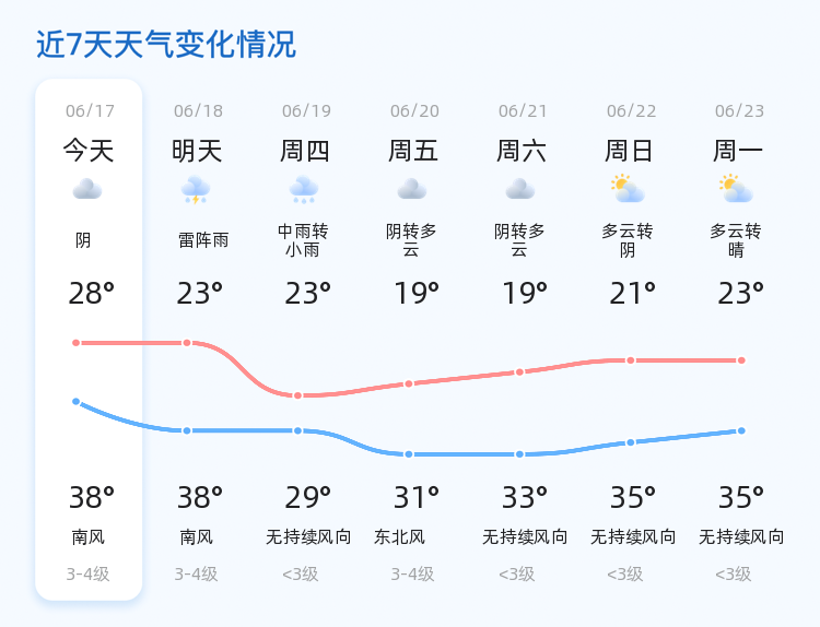 今天夜间阴转雷阵雨,南风1级,气温28~38℃,明天天气雷阵雨,气温跟今天差不多,最高气温38℃, 最低气温23℃。