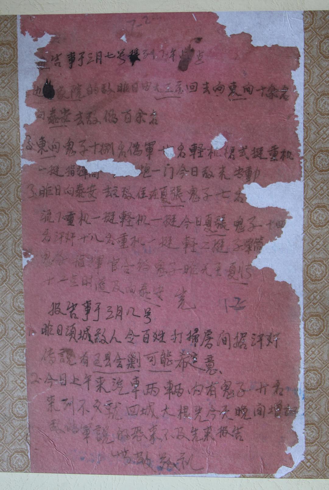 “边家院的敌,昨日由大王庄回去向东向十余名,向泰安去敌伪百余名。”“东向鬼子十捌名伪军20名,轻机枪式挺重机一挺、指(掷)弹筒口口,炮一门,今日敌未出动。”“昨日湏城敌人令百姓打扫房间,据汗(汉)奸传说有五县会剿可能,希注意。”这些文字,出自1940年3月泰西地下情报总站所收的一份密报。
