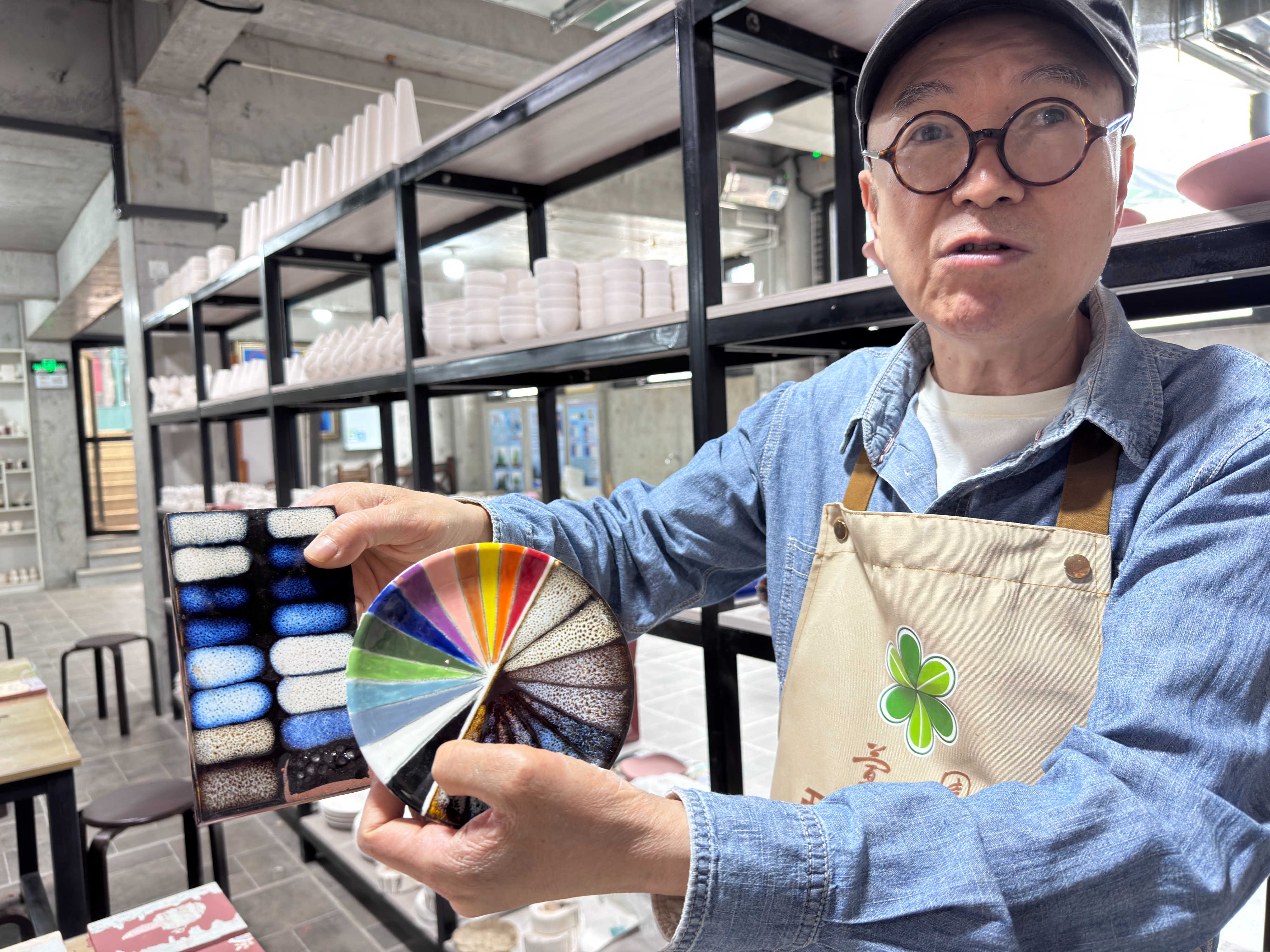 从小学习美术的赵锦星,首先被壁画所吸引,随后马上注意到壁画所用的材料——淄博高温窑变花釉。