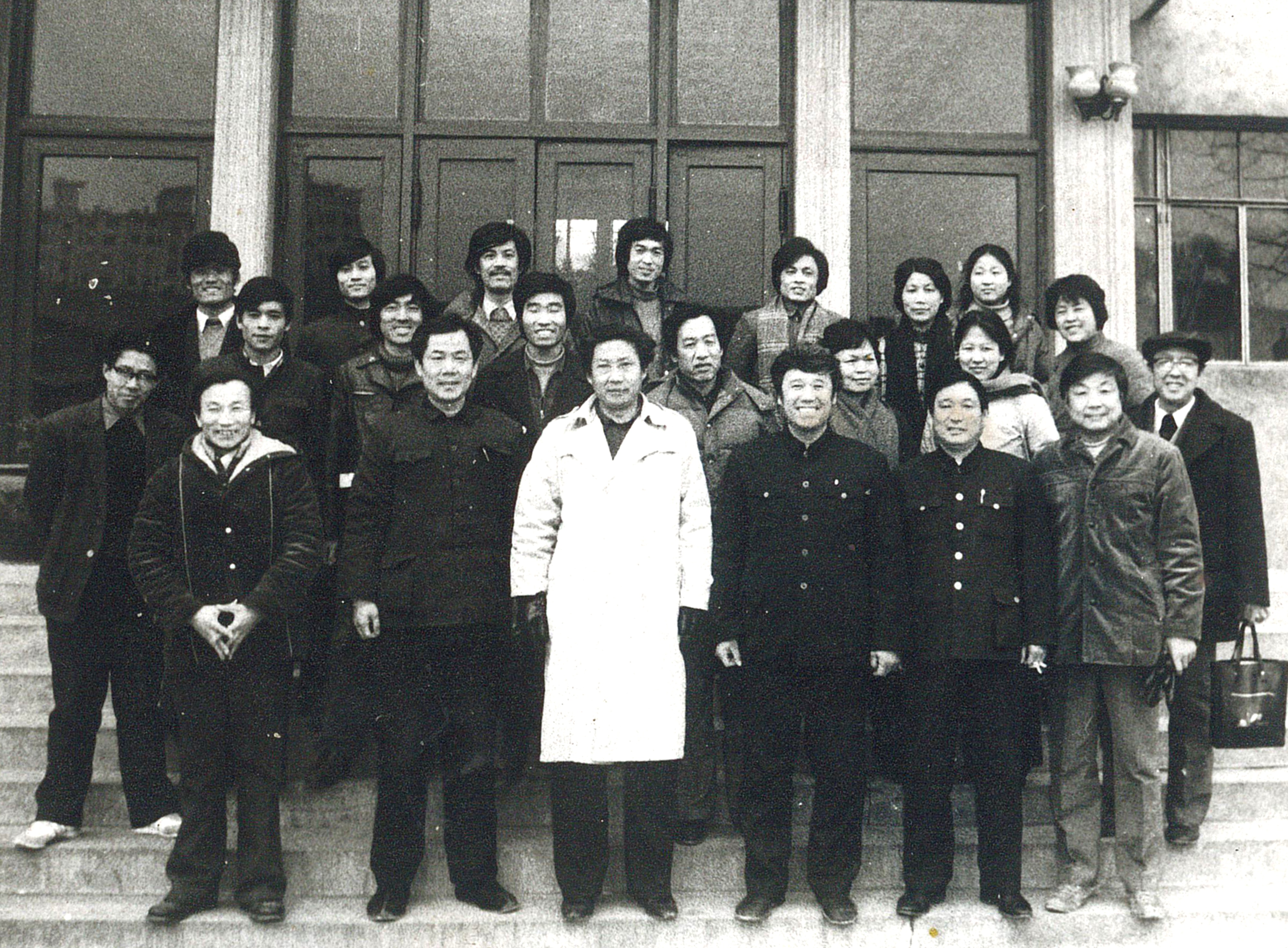 1986 年淄博市油画壁画艺术研究会第一次会议在平板玻璃厂召开。前排左三为会长杨春明,前排左二为胡升刚,前排右一为朱一圭,前排右三为刘同佑。