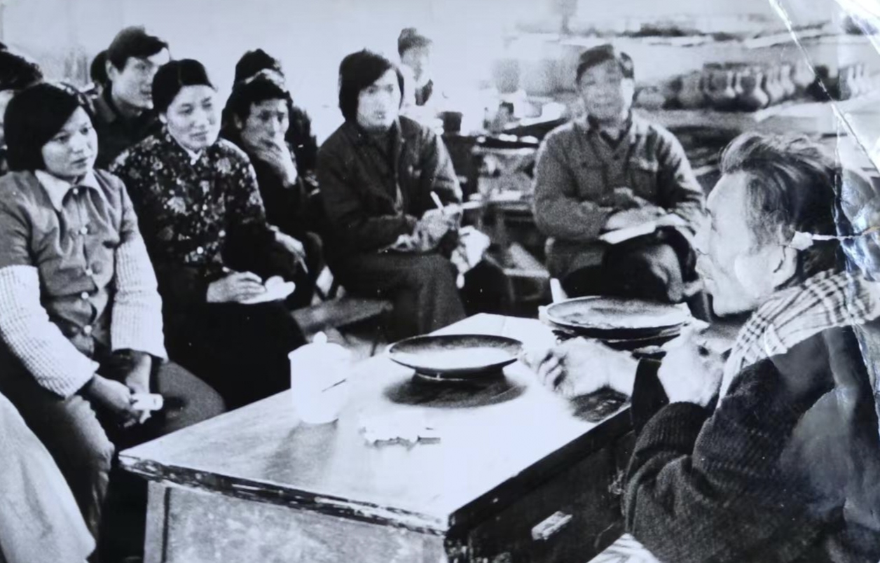 1985年,吴冠中老师在美陶五车间讲课,主题是“风筝不断线”艺术观点。前排右起,吴冠中、朱一圭、赵锦星、蒋衍山、熊淑文、贾元芹。