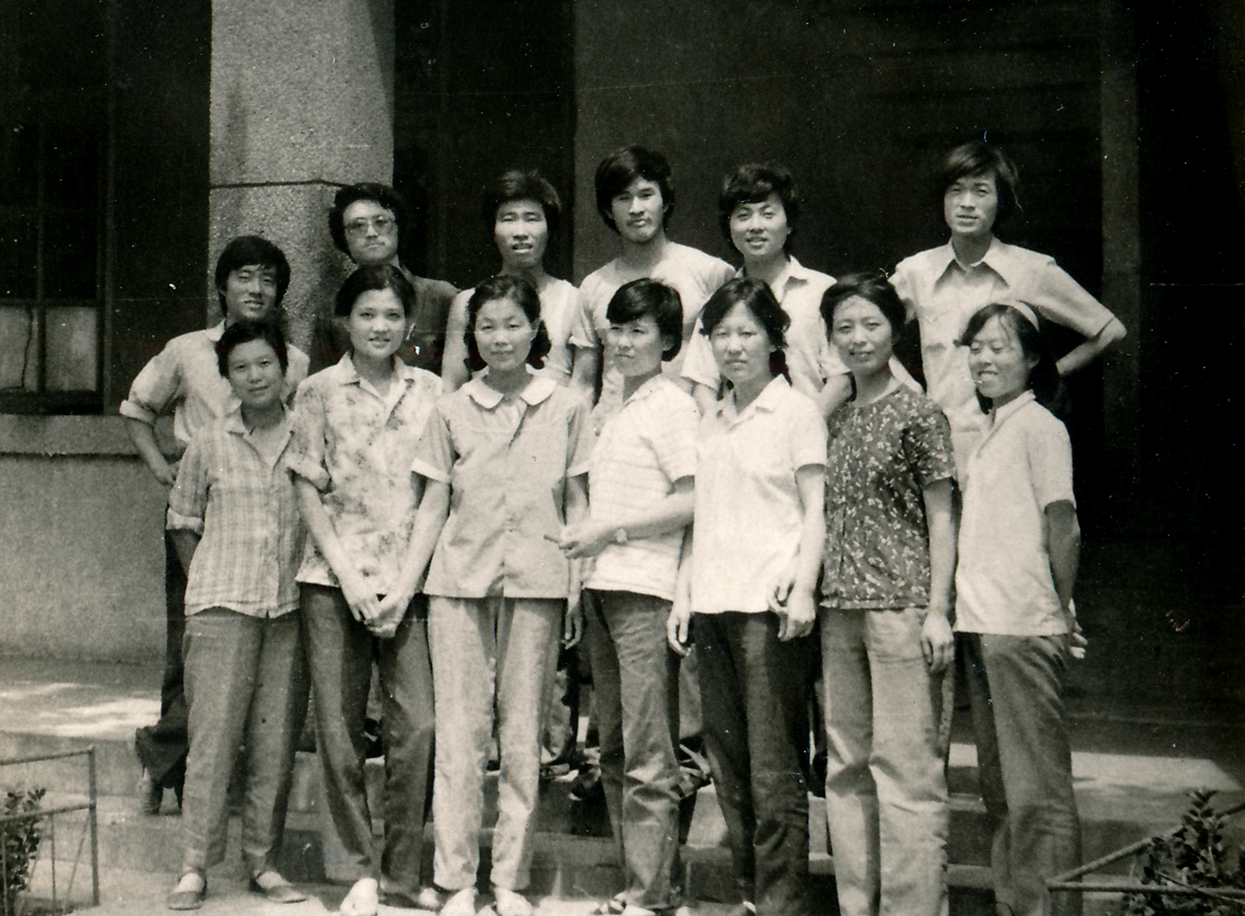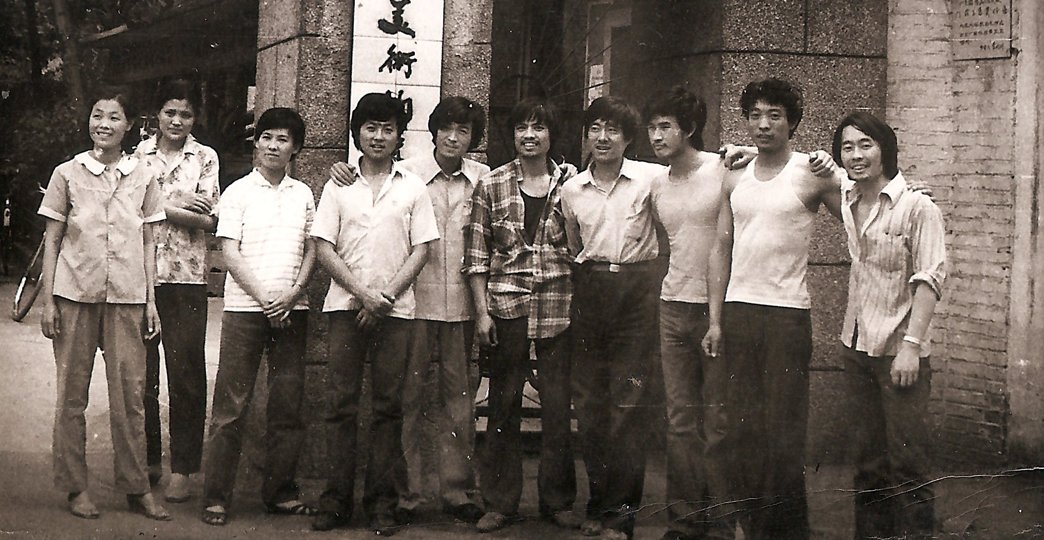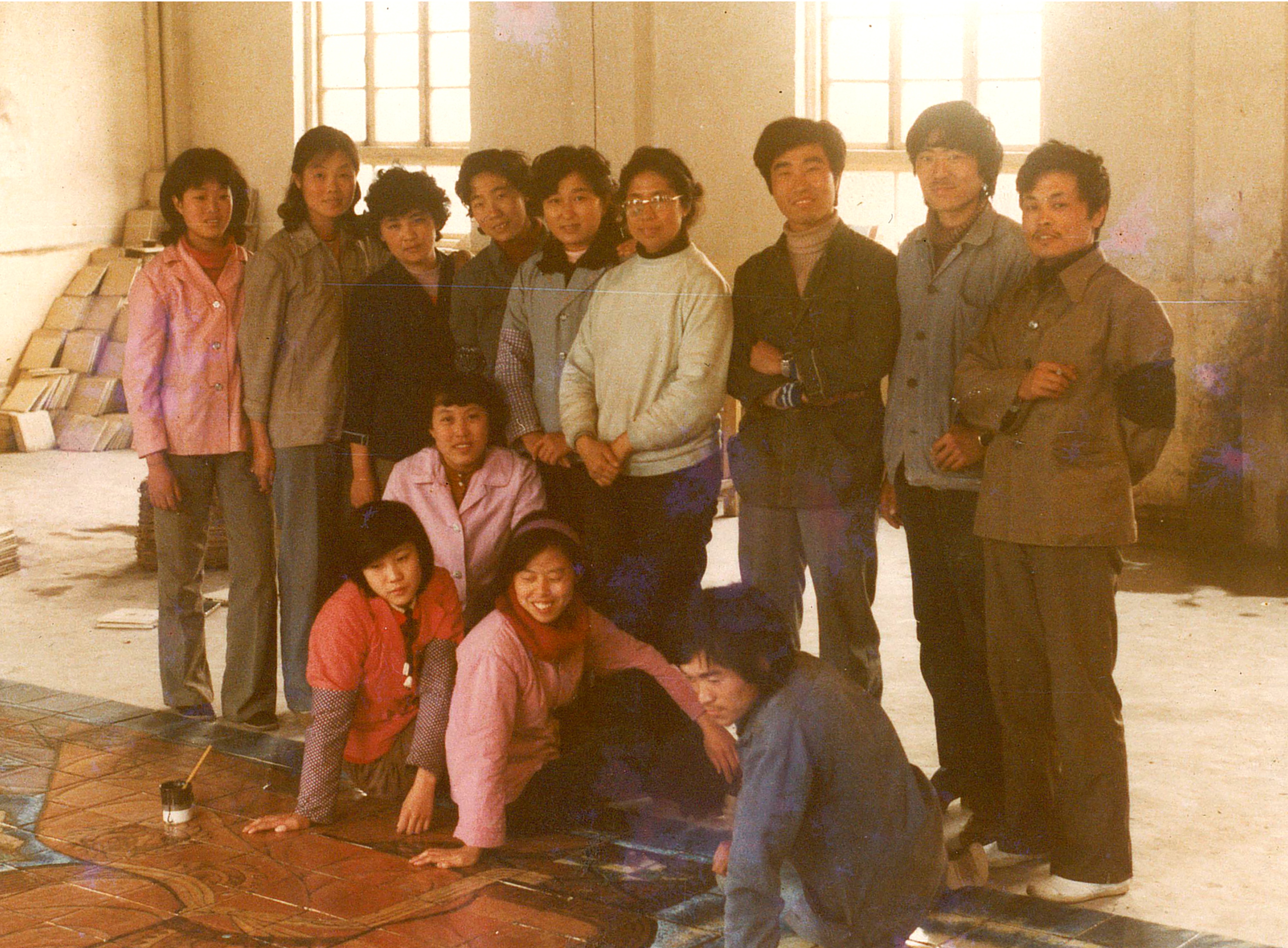 1985年,参与钓鱼台宾馆壁画制作的美陶五车间部分青年职工,中央工艺美院青年教师王根木(后排右五)参与设计了这幅作品,赵锦星(后排右一)去北京对接了这项工作。