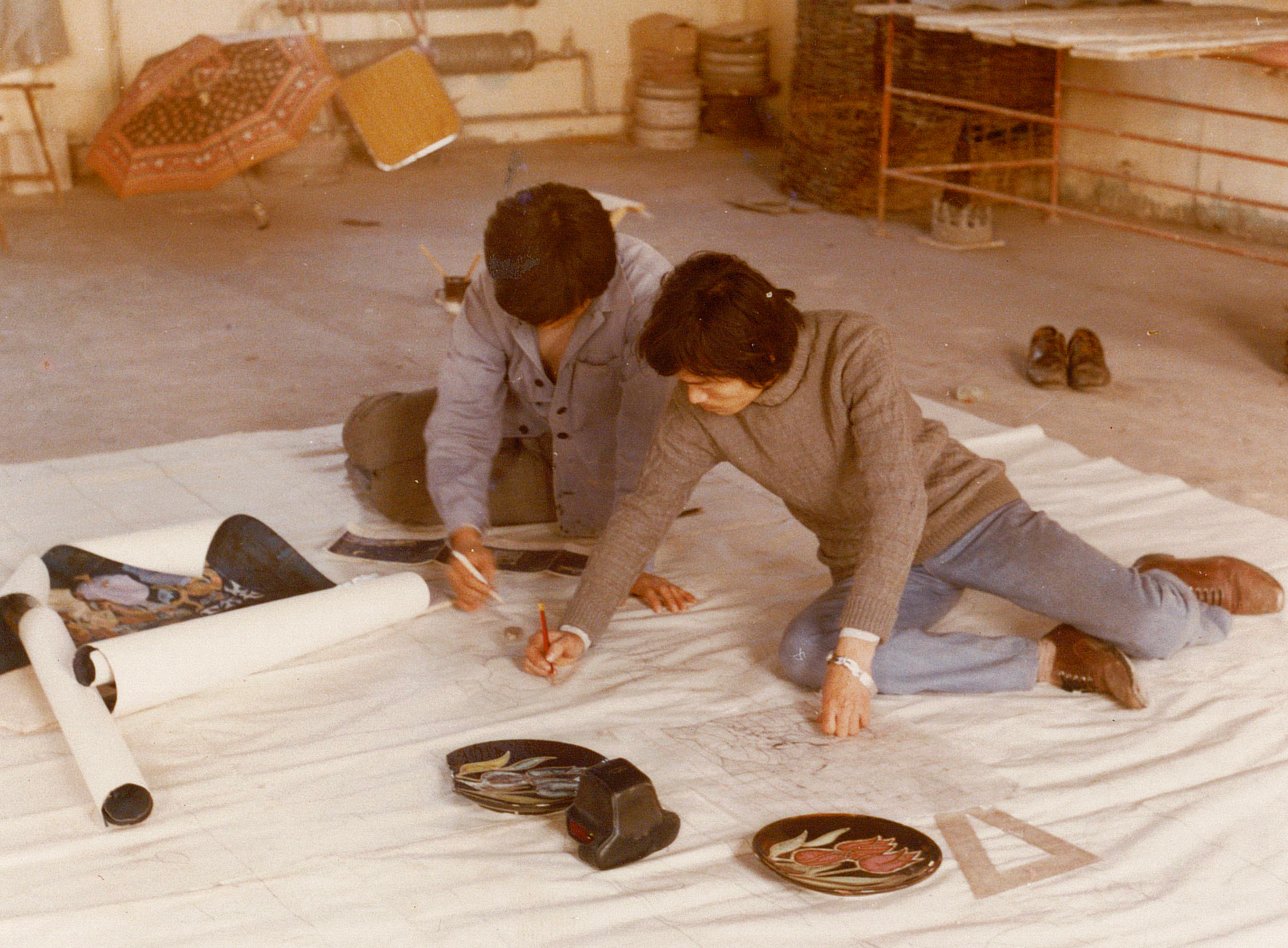 1986年,赵锦星(右)和师弟胡云飞在美陶五车间放大壁画稿。