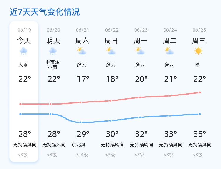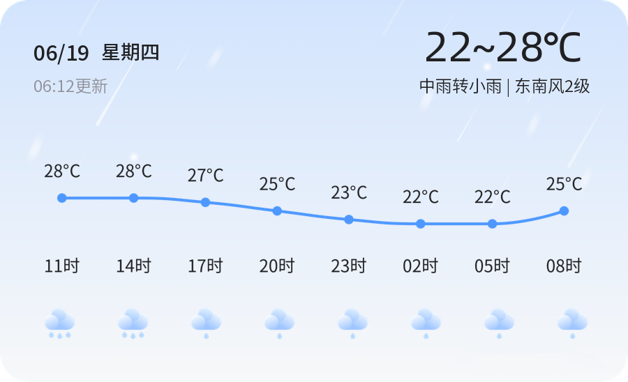 今天是6月19日,星期四,农历五月廿四。德州迎来持续降雨天气,今日气温在22℃至28℃之间,目前气温为24.7℃,天气状况为中雨转小雨,东南风2级,空气湿度为78%,PM2.5指数为28,空气质量良好。全市各区均出现降雨天气,市民出行需携带雨具,注意交通安全。 明天德州天气为中雨转小雨,气温与今日持平,但风力稍有增强。由于持续降雨,道路湿滑,驾车出行需减速慢行,保持车距,确保行车安全。 未来三天德州天气趋势为多云到晴天,气温将逐渐回升,最高气温可达35℃,最低气温为17℃。市民需注意天气变化,及时增减衣物,预防感冒。特别是雨后湿度较大,可能对身体造成不适,建议市民多喝水,注意饮食清淡。 温馨提示