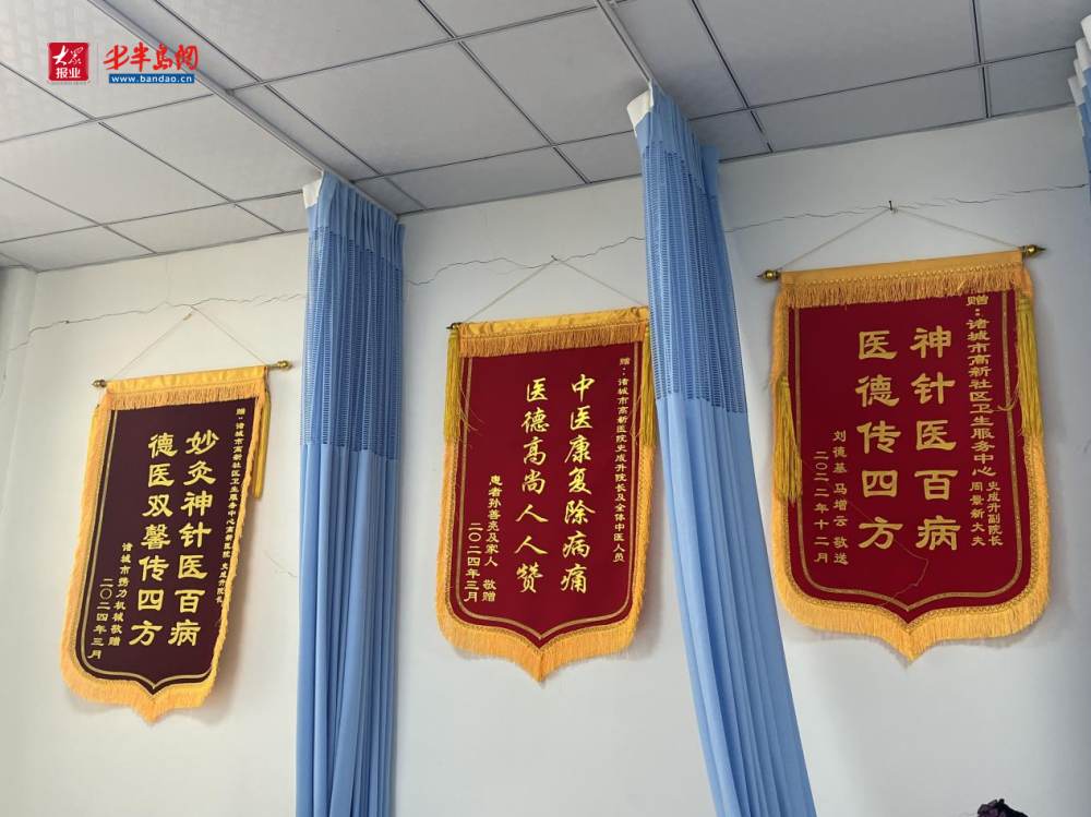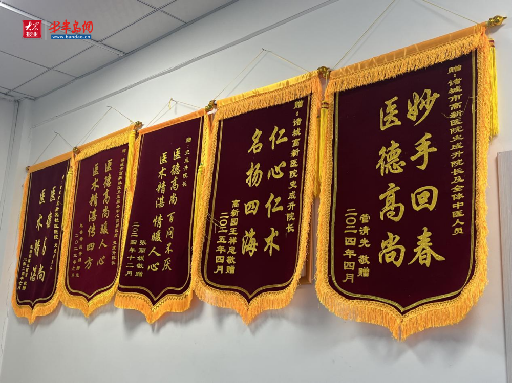 史成升此前在诸城前齐沟三村坐诊,因为医术高超,他转来诸城市高新社区卫生服务中心后,很多村民都追随他而来。诊室墙上,一面面锦旗如红云叠翠,“医德高尚,妙手回春”“医术精湛愈人身,医德高尚暖人心”等烫金大字熠熠生辉,无声诉说着患者们的感激与信赖。