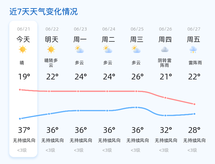 今天夜间晴,北风3级,气温19~37℃,明天天气晴转多云,气温跟今天差不多,最高气温36℃, 最低气温22℃。