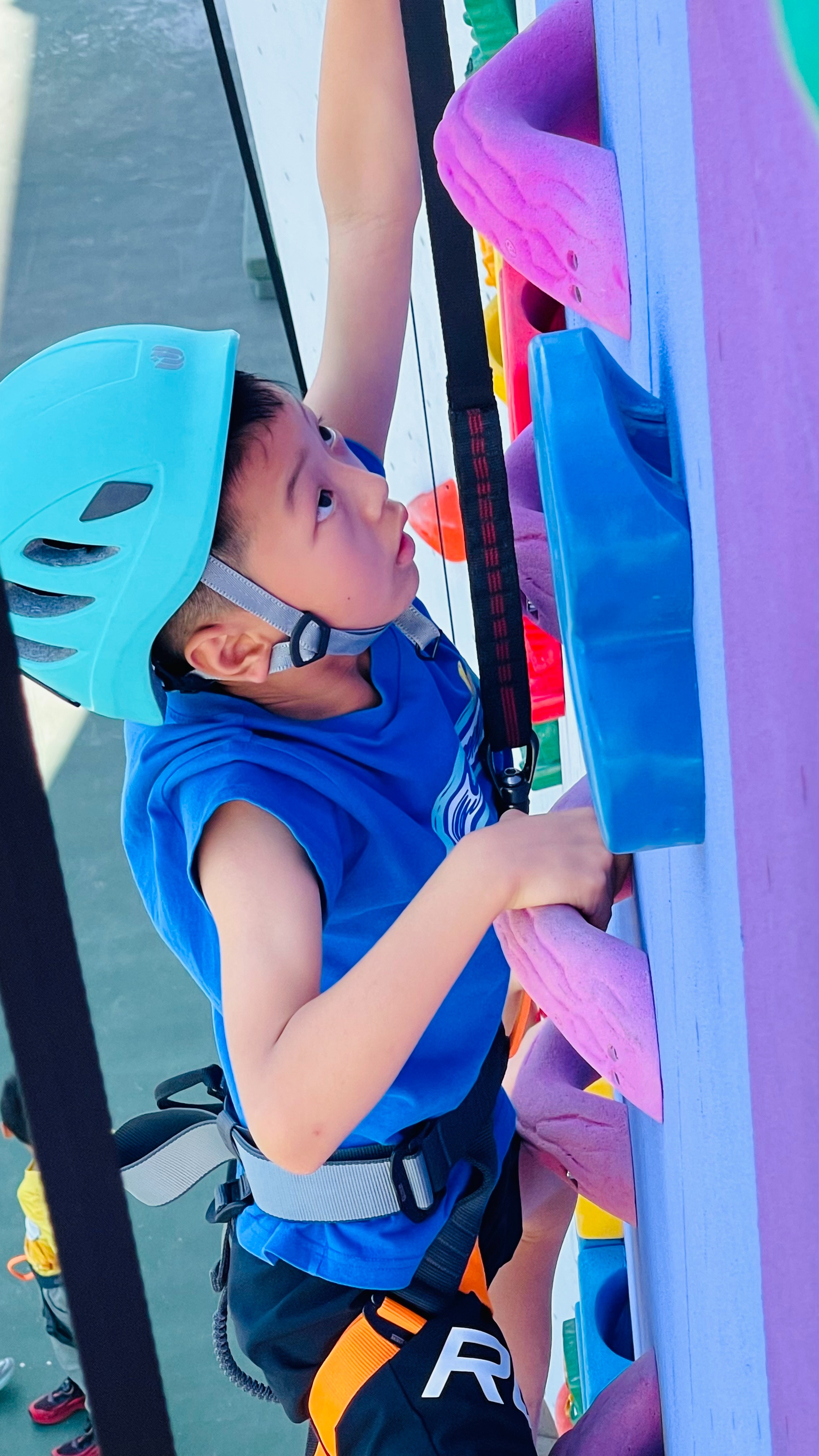 然而当安全绳扣紧,在教练的鼓励和同伴的目光注视下,挑战开始了。攀登的过程并非一帆风顺。不少小记者在攀至3、4米高度时,第一次低头下望,瞬间的眩晕感让动作变得僵硬。有人悬在半空,指尖因用力而泛白,呼吸变得短促,眼神里闪过一丝慌乱。“别往下看!只盯着你头顶上方的那块岩石!”宋亮教练沉稳有力的指导声穿透空间传来,如同一根无形的支柱。小记者王婧洢在离地约8米处停留了近一分钟,她后来说:“那一刻感觉身体被钉住了,脑子里一片空白。但听到下面伙伴的加油声,我咬咬牙,又往上够了一格。”