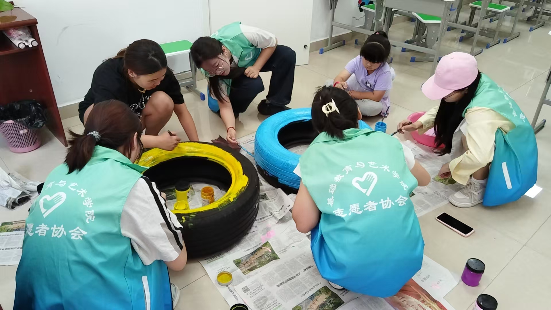 了环保理念。”“我与同学合作将一个废旧轮胎画上了美丽的花朵,希望我们的作品能获得居民的喜欢,也倡导大家发挥想象力将废旧物品再利用,变成生活日用品或者美丽的艺术品,为我们美丽的地球减负。”参加活动的大学生说道。