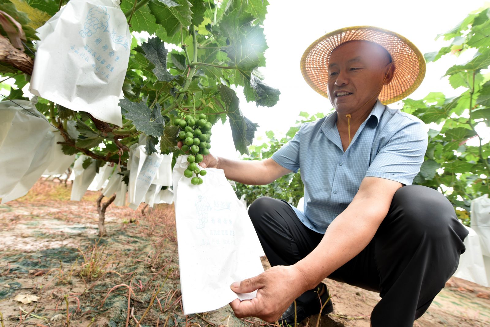 6月20日,在聊城市茌平区贾寨镇贾寨后村葡萄园里,农民在查看葡萄长势。(赵玉国 王昕 摄)