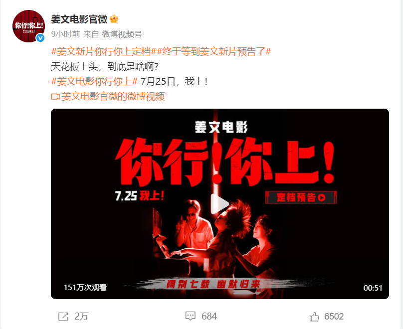 6月25日,姜文导演的新片《你行!你上!》官宣定档暑期档7月25日。