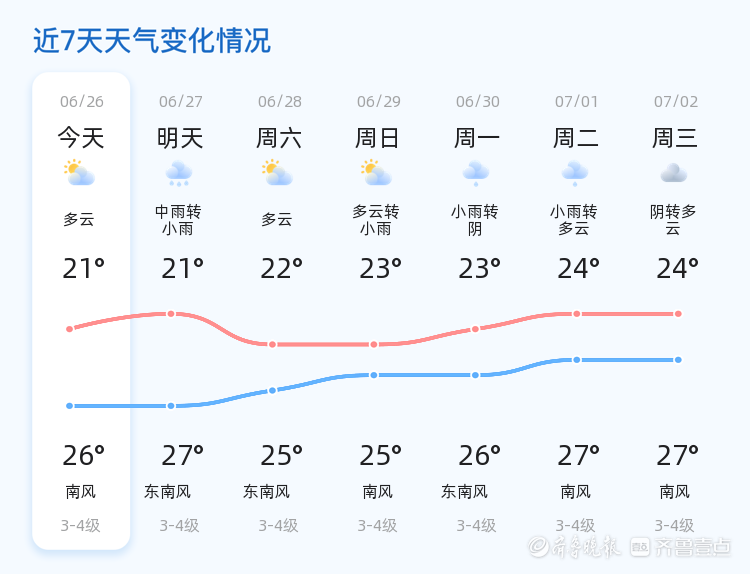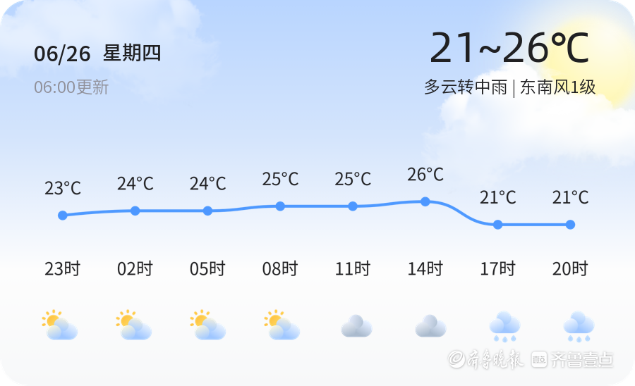 今天是6月26日,星期四,农历六月初二。青岛市今日天气多云转中雨,气温在21℃至26℃之间,东南风1级,空气湿度高达94%,PM2.5指数为52,空气质量良好。各区天气情况基本一致,均以多云转中雨为主,市民需注意携带雨具,防范降雨带来的不便。