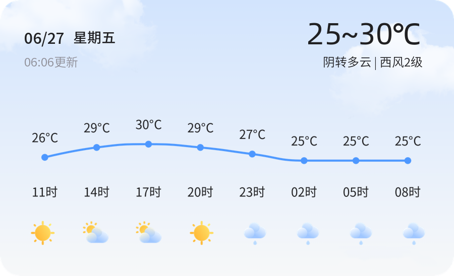 今天是6月27日,星期五,农历六月初三。济宁市今日天气阴转多云,气温介于25℃至30℃之间,西风2级,空气湿度91%。目前空气质量良好(PM2.5为26),适合户外活动。市民出行时建议携带雨具,以备不时之需。上午时段气温逐渐升高,建议市民注意防晒,及时补充水分,以应对炎热天气带来的不适。同时,由于湿度较高,早晨时段可能有雾气,驾车出行时请注意保持车距,确保行车安全。