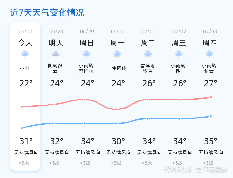 未来三天,淄博市天气将呈现一定的波动性。6月29日,天气为小雨转雷阵雨,气温24℃至34℃;6月30日,天气为雷阵雨,气温24℃至30℃;7月1日,天气为雷阵雨转阴,气温26℃至34℃。提醒市民,未来三天降雨较为频繁,尤其是雷阵雨天气,需注意防范强降雨可能带来的次生灾害,如城市内涝等。