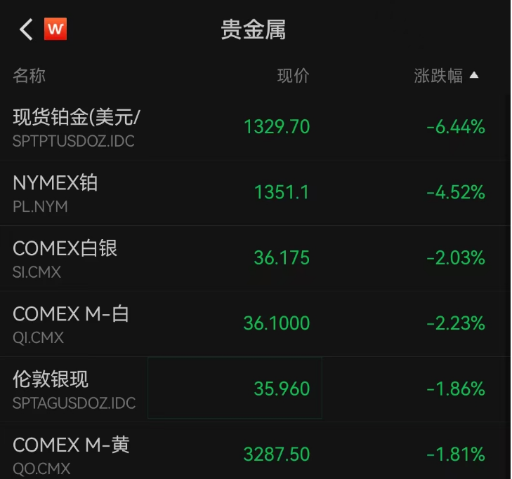 黄金、铂金双双大跌。截至20:36,伦敦金现货价格跌1.69%至3271美元/盎司,一日大跌超50美元;COMEX黄金期货价格跌至3289美元/盎司,二者均触及近四周以来新低,现货铂金跌幅更猛烈,截至20:36,跌幅超6%,报1329美元/盎司。