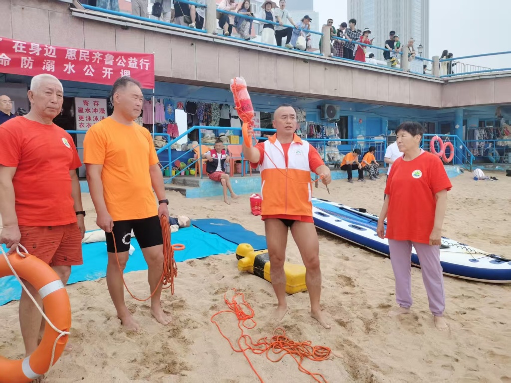 “这次是我们青岛市救生协会响应山东省救生协会,通过对专业的救生救援知识和技能做一个系统的培训,让志愿者们更好救助落水者。”青岛市救生协会会长祝焕庆说。祝焕庆还提醒,恶劣天气切莫下海游泳,应在设有救生人员执勤的时间和海域游泳,听从指导勿超越防鲨网警戒线,不会游泳者不要依赖充气式浮具(如游泳圈、浮床等)到深水区,万一浮具泄气,容易造成溺水。