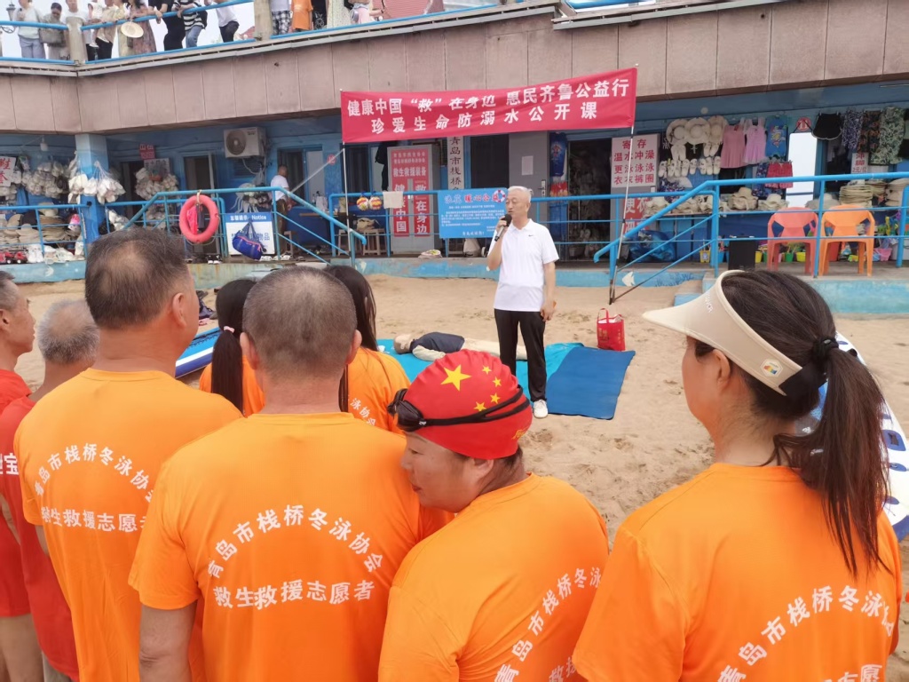6月28日上午,在栈桥附近的青岛第六海水浴场,一场主题为“健康中国‘救’在身边,惠民齐鲁公益行”的珍爱生命防溺水公开课火热“开讲”,吸引众多“巧克力大爷”、志愿者等参加。此次活动由青岛市救生协会倡导,青岛市栈桥冬泳协会主办,活动持续了一个多小时,引发现场市民游客围观、点赞。