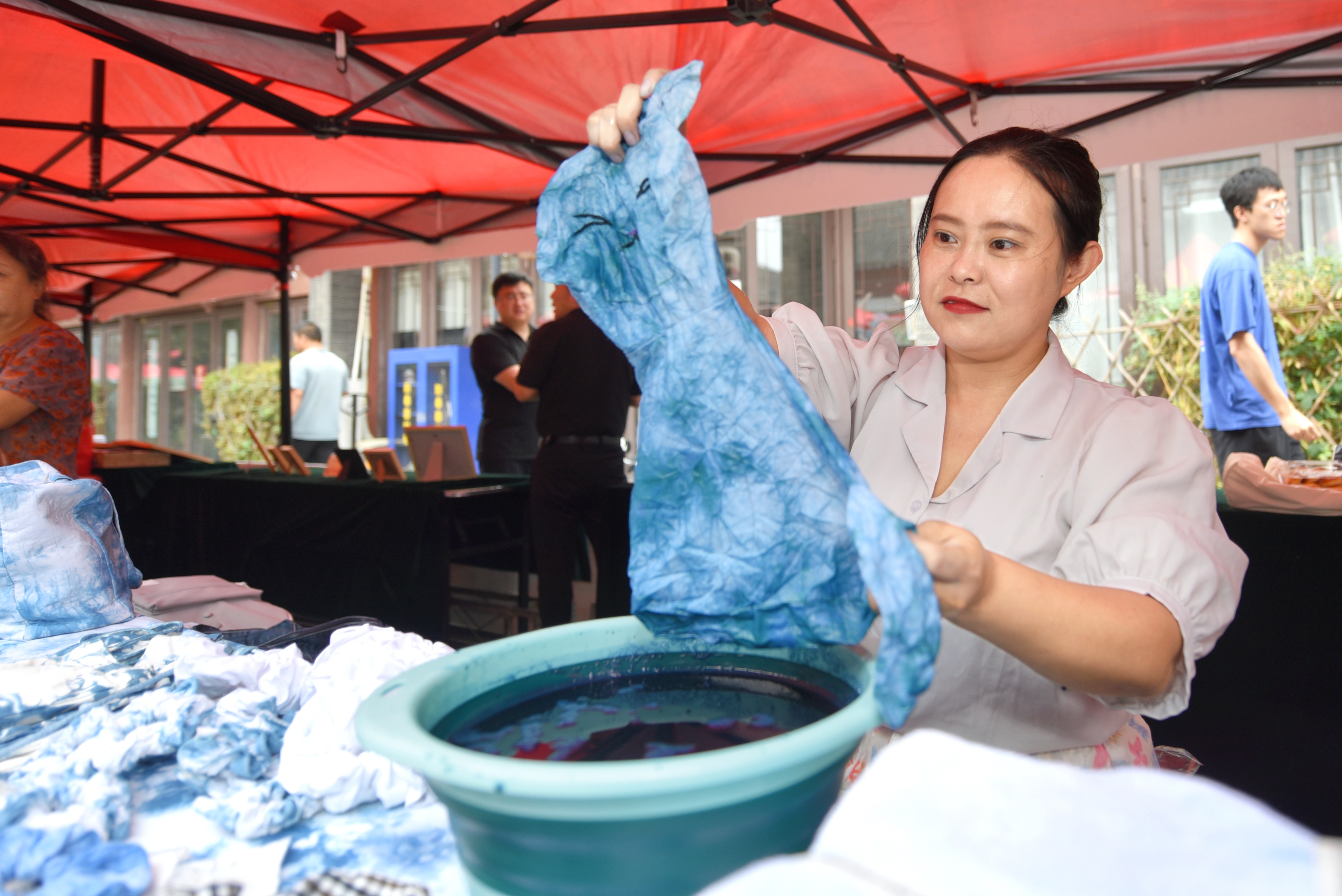 来自武城县的扎染传承人王岩正在现场制作一个扎染玩具玩偶,吸引了很多小朋友的关注,区别于普通的扎染,王岩扎染运用的材料内含有板蓝根,为纯植物可以减少对皮肤的刺激,抑制蚊虫螨虫,90后的她与这项非遗的缘分源于他的奶奶,“小时候为了防止蚊虫叮咬奶奶就用板蓝根做底料给我扎染缝制衣服,大学毕业后我就跟奶奶学习了染布技艺,并申请了非遗品牌廷兰巷,希望可以通过此次运河大集把这项纯植物的板蓝根扎染工艺宣传出去。”王岩说。