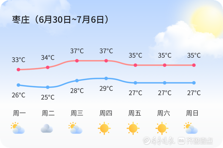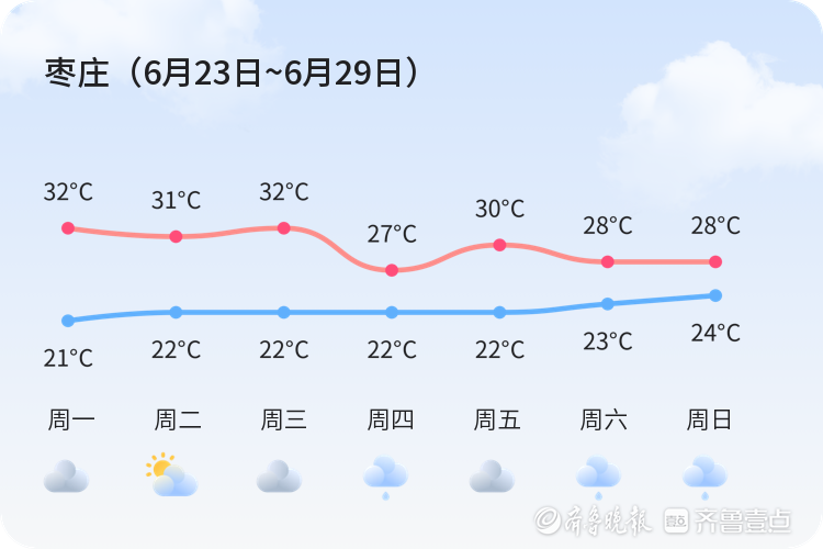 全市周平均最高温29℃,平均最低温22℃,平均气温26℃,周最高气温32℃,出现在周一、周三,周最低温21℃,出现在周一。