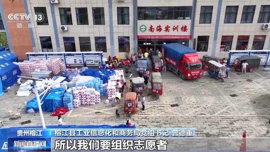 榕江县工业信息化和商务局党组书记 曾德重:因为今天任务很重,要把水拉到社区分发。然后捐赠的物资也源源不断发过来,所以我们要组织志愿者,把这些货全部下到仓库。