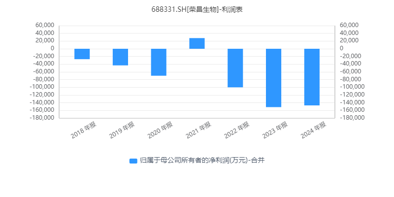 乐观预期的背后,是荣昌生物长期深陷的行业共性难题——持续巨额亏损。在拥有财务记录的七个完整年度里,荣昌生物亏损了六年:2018至2020年归母净亏损分别为2.70亿元、4.30亿元、6.98亿元,呈扩大趋势;2022至2024年亏损额更是高达9.99亿元、15.11亿元和14.68亿元。