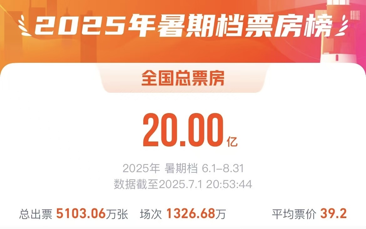据网络平台数据截至7月1日20时53分2025年暑期档6月8月总票房含预售突破20亿央视新闻