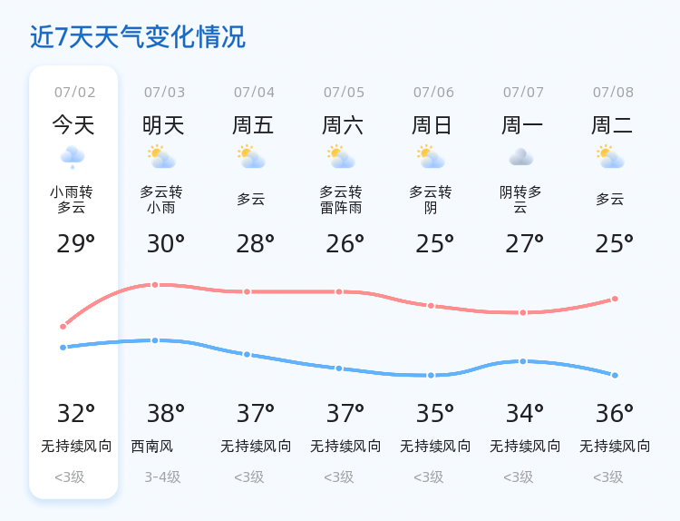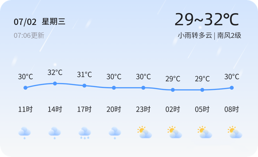 今天是7月2日,农历六月初八。东营市迎来小雨转多云的天气,气温在29℃至32℃之间,湿度高达96%,南风2级。全市各区普遍出现小雨天气,局部地区降雨较为明显,市民出行请注意携带雨具,注意交通安全。今天的空气质量良好,PM2.5指数为15,适宜户外活动。