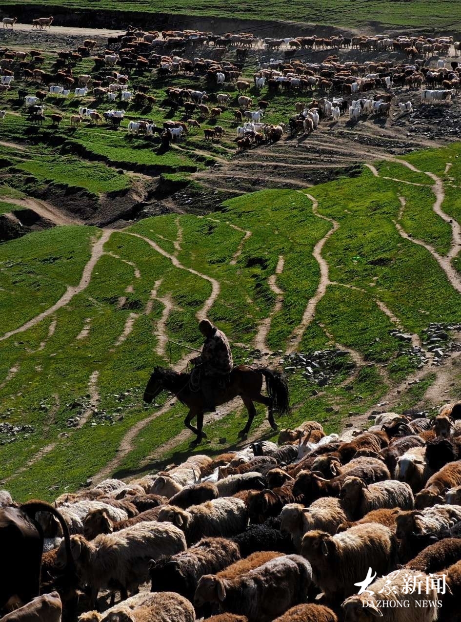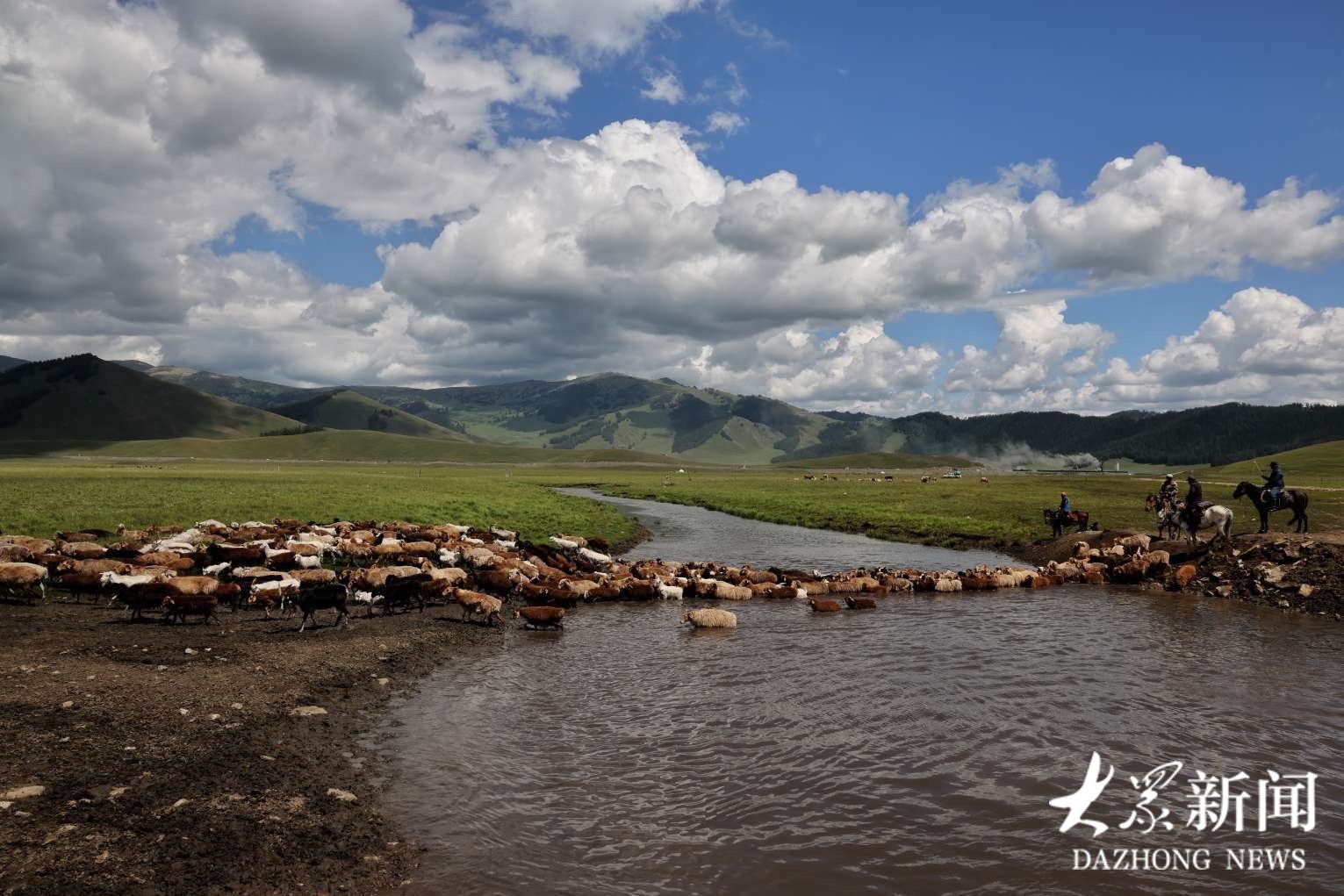 河流蜿蜒穿过牧场,牲畜饮水、嬉戏,牧民骑马守望,山水相依,人畜相谐。