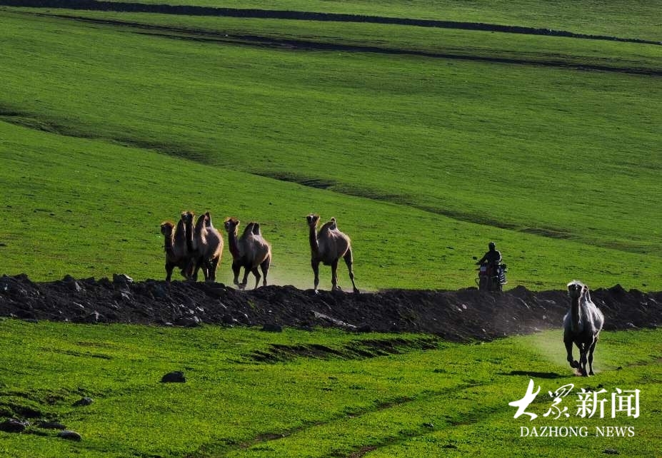 极目远眺,广袤草原似柔软绿毯,从脚下向远方铺展。羊群如散落云朵,或啃食青草,或静卧休憩;骆驼群缓缓踱步,与远处山峦、蓝天、白云相融,绘就塞外图景。
