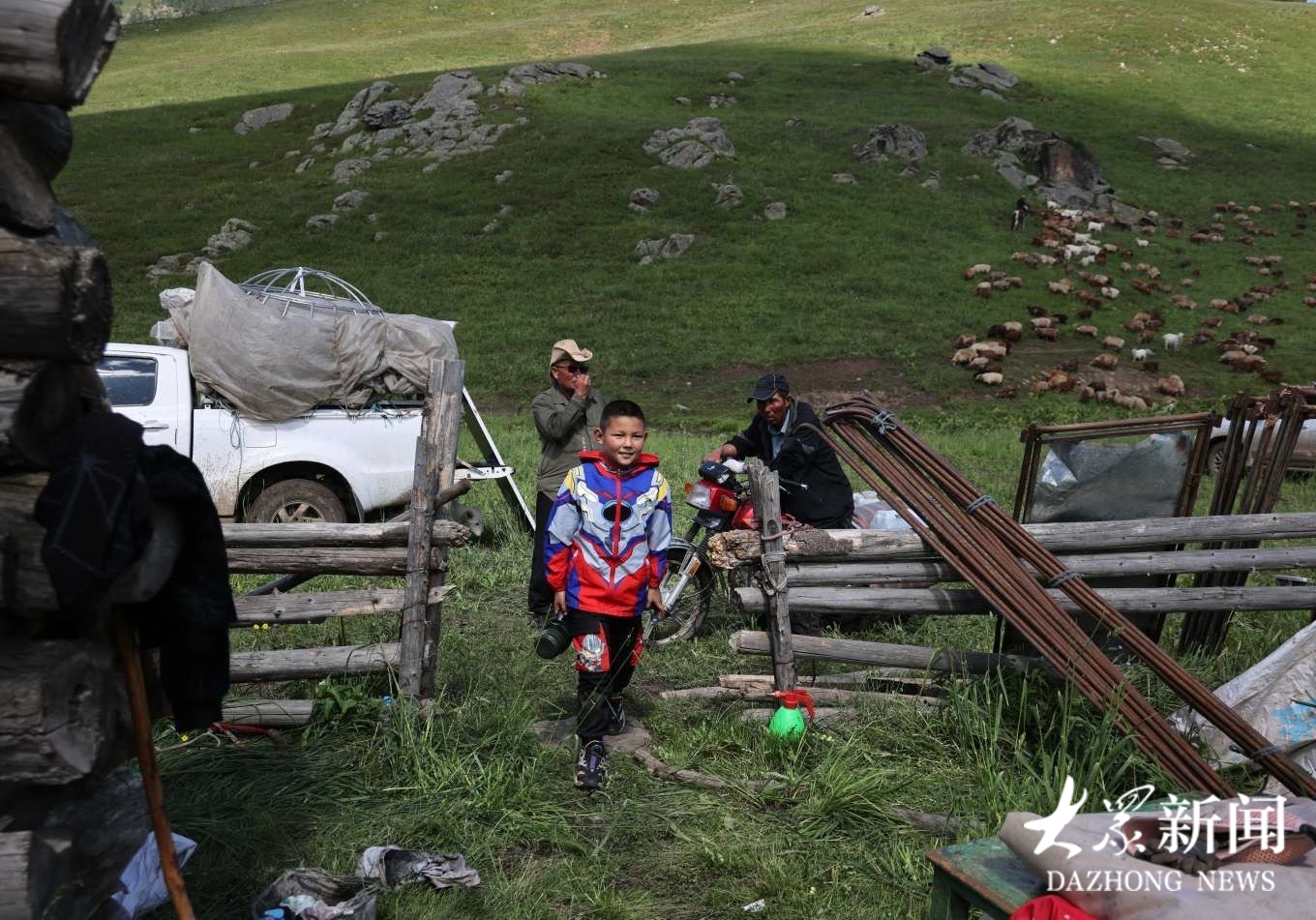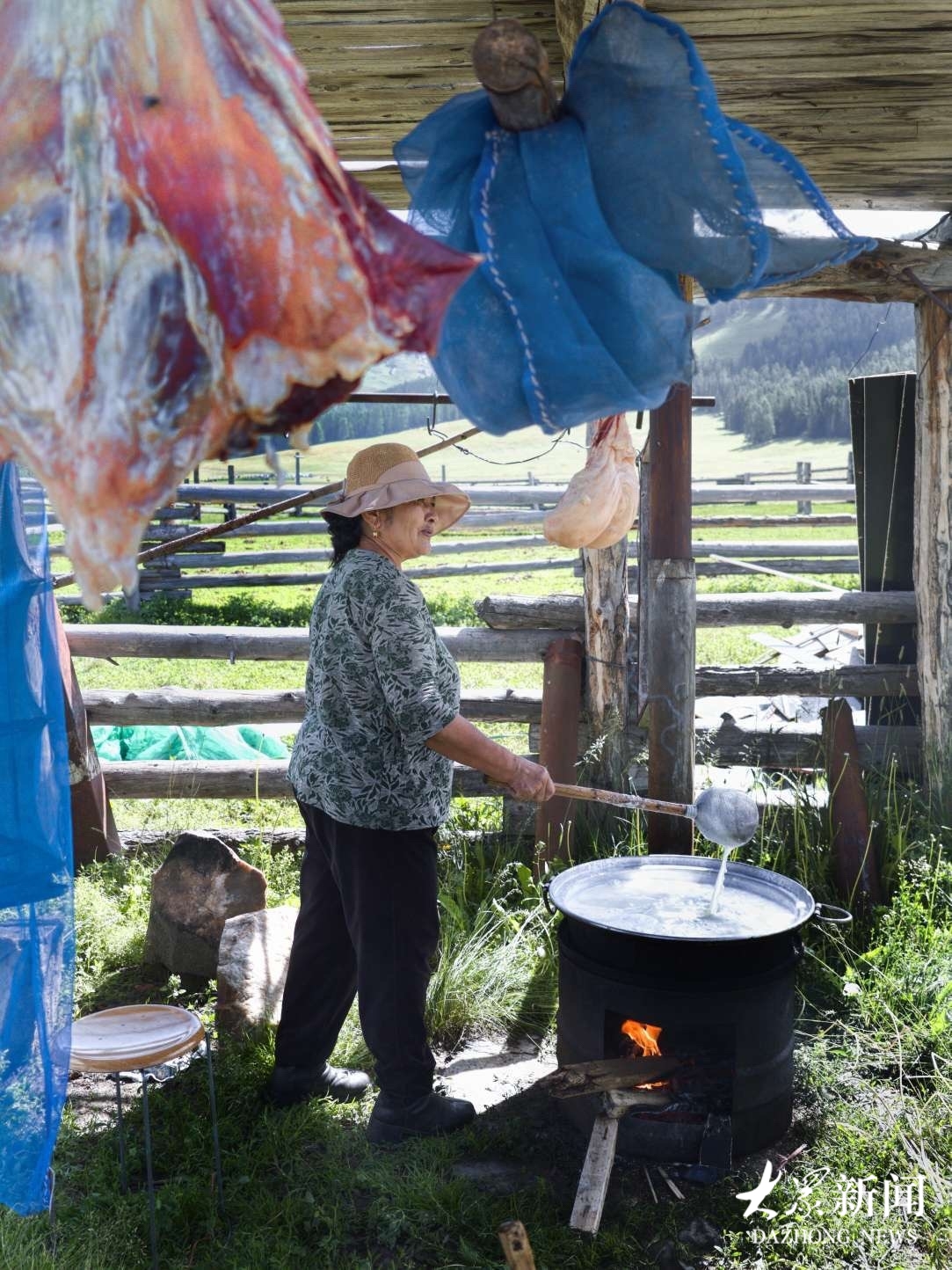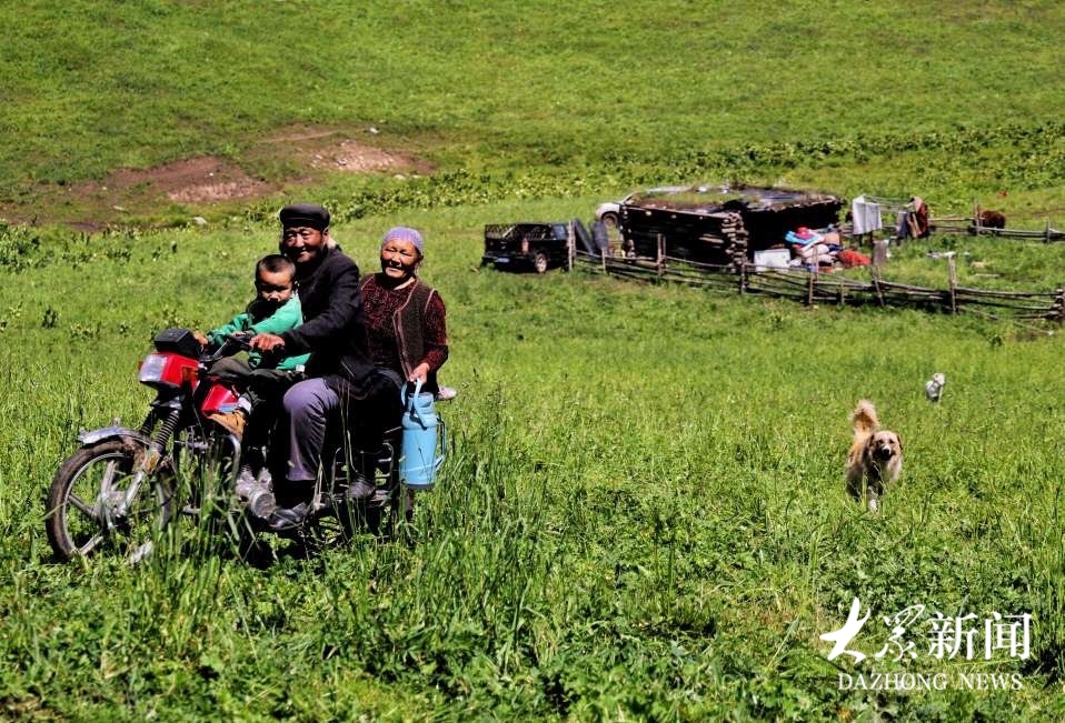 走进牧民日常生活,处处烟火温情。摩托车载着一家人穿梭草场,老人笑纹里藏着岁月,孩子眼眸闪烁好奇,小狗欢快追逐;毡房、车辆旁,是劳作的身影;棚下,主妇执勺烧牛奶,烟火气缭绕。