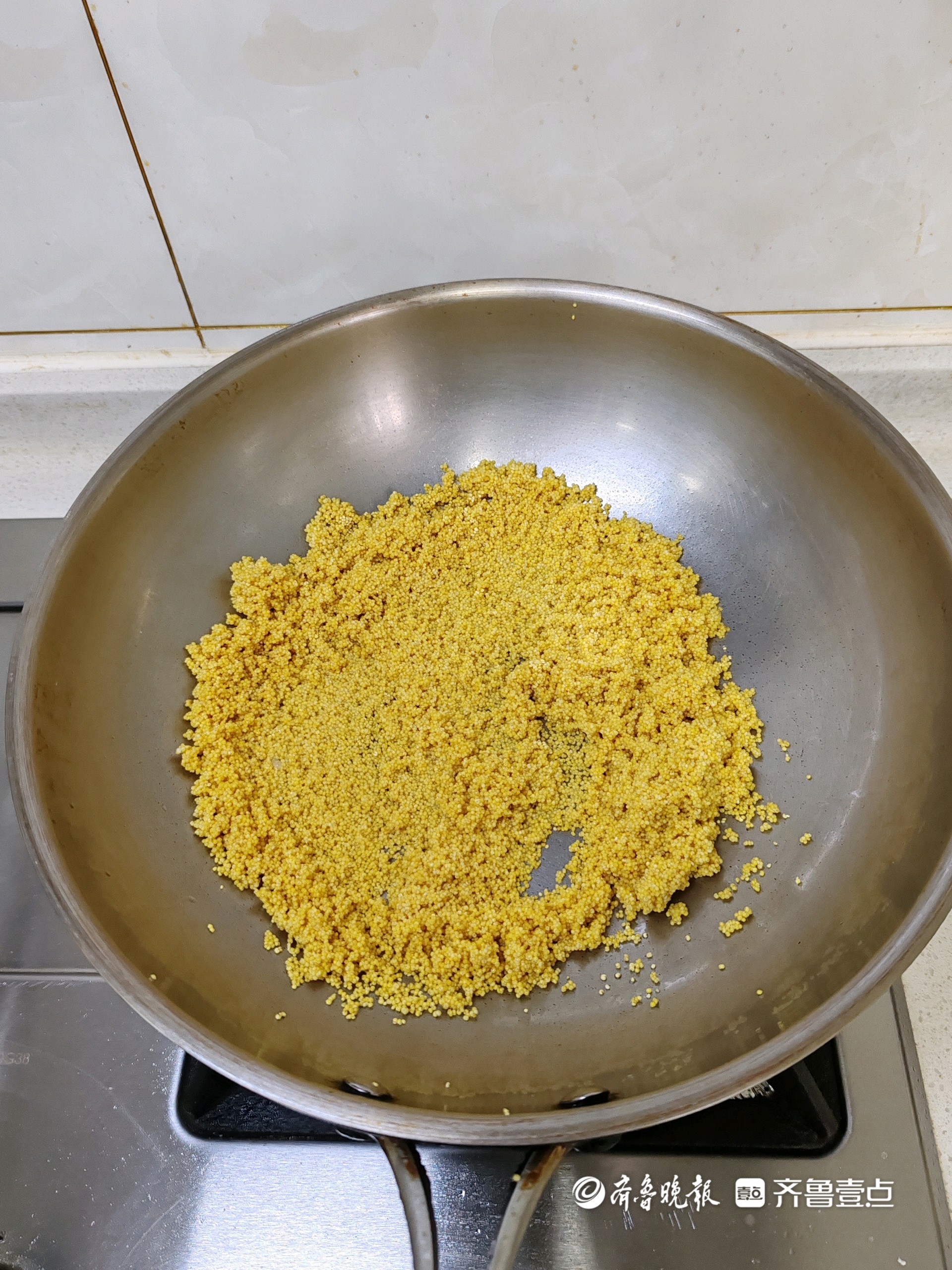 4.最好用厚底锅,把锅烧热,少放点油防粘,把小米放锅里炒干水分,然后放姜丝,红枣条,全程慢火,不停地翻炒,别炒糊了,待小米微黄,就可以出锅了。