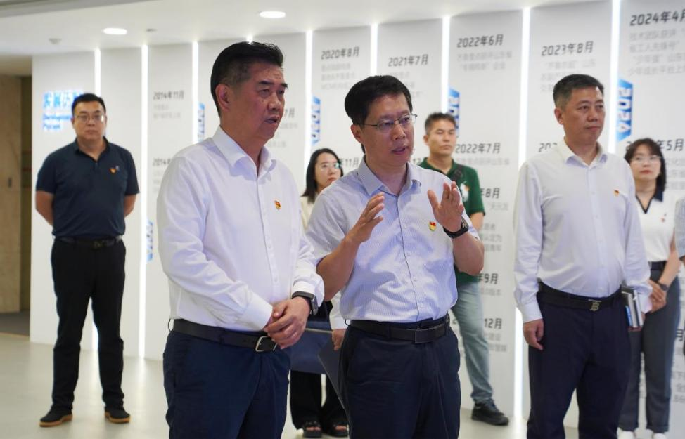 徐中流一行首先走进山东数文集团数智展厅,了解数字文化产业建设情况,感受“壹点天元”元宇宙空间、“壹点天玑”传媒大模型、“壹点天眼”内容风控平台和“壹点天成”数字人平台等建设成果,近距离体验AI创作校审新闻稿件、齐鲁文化大模型、吕剧数字星谱、浩宇数字超然楼等数字化产品。